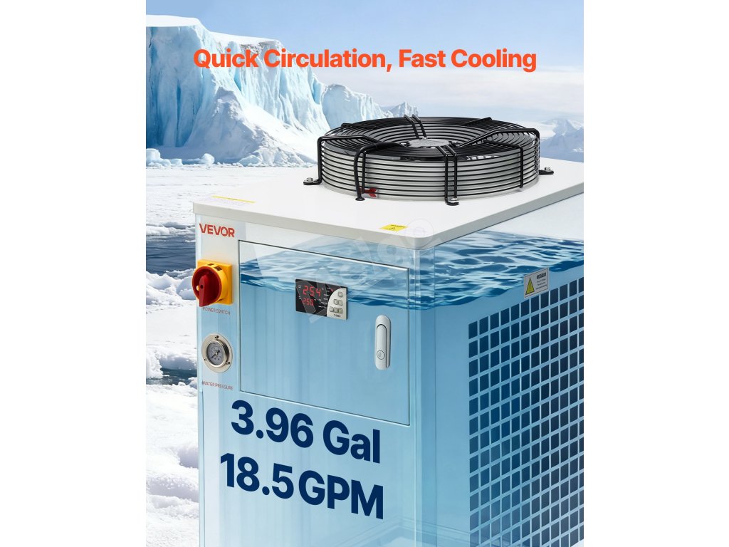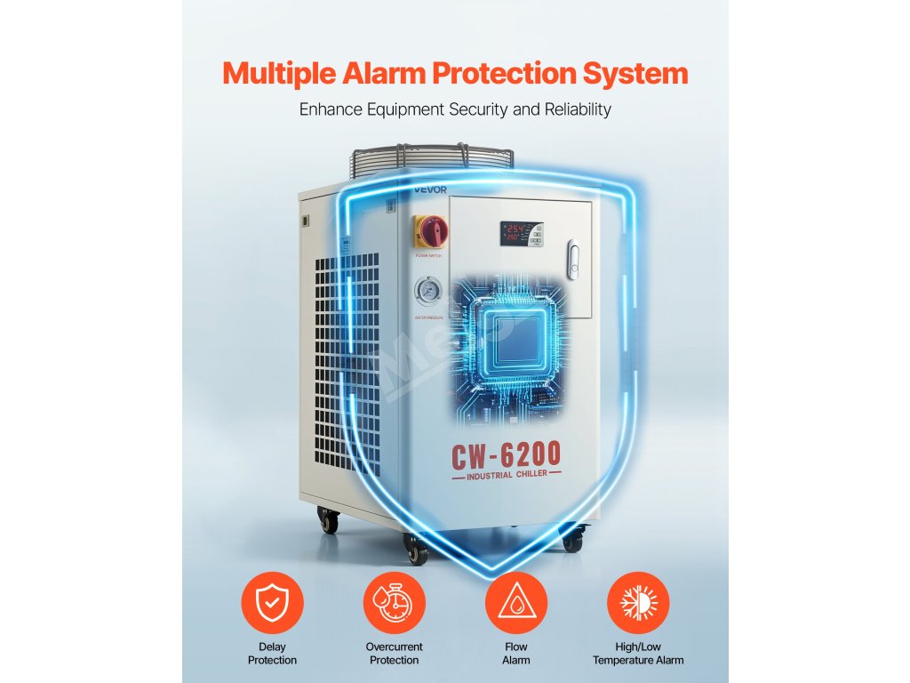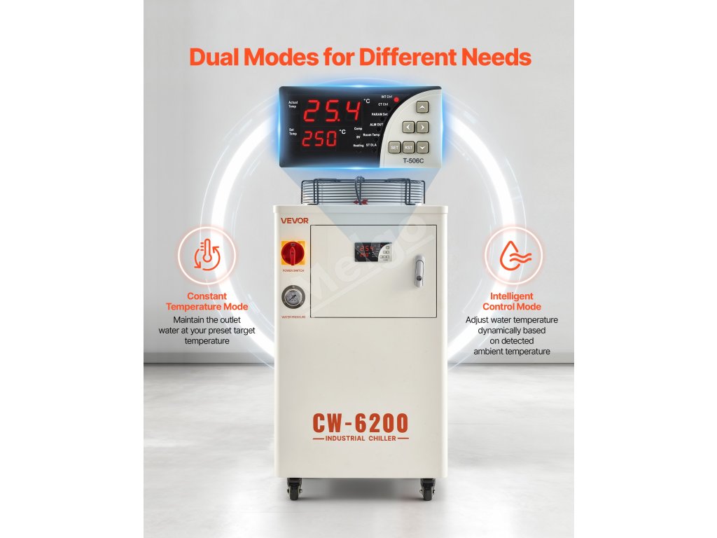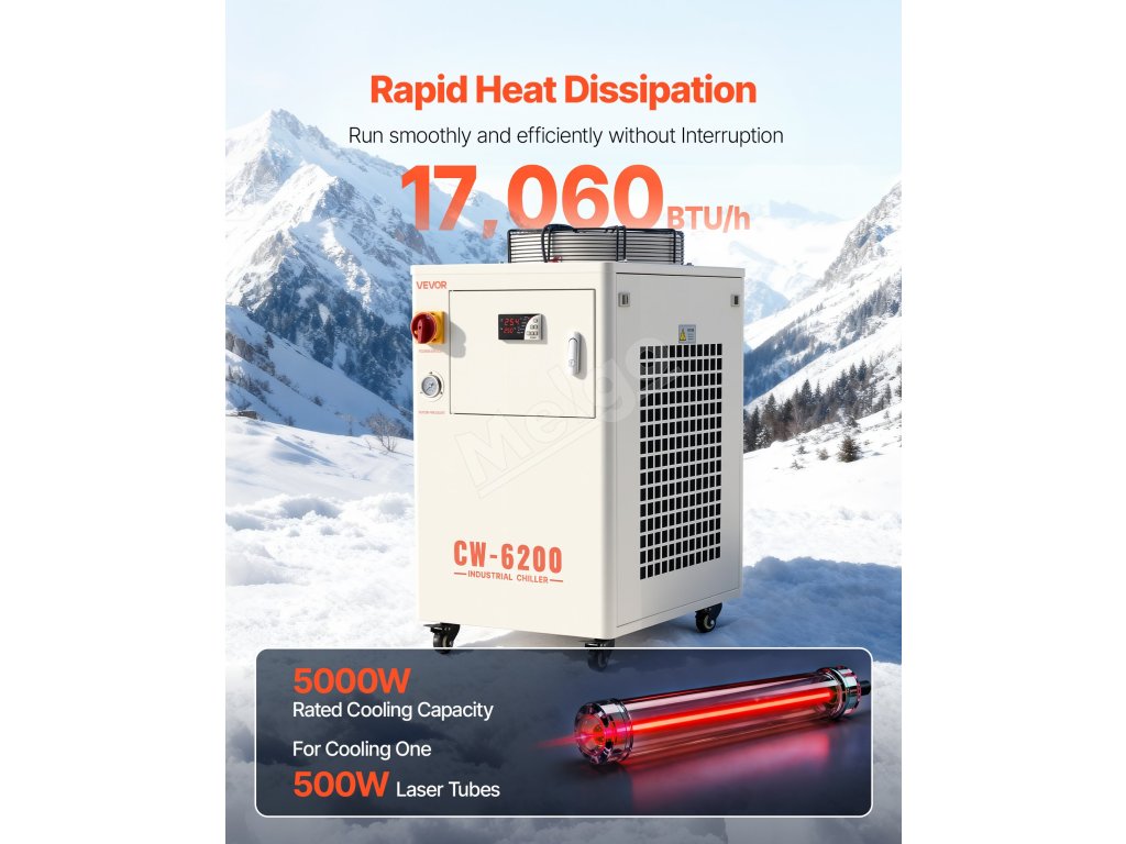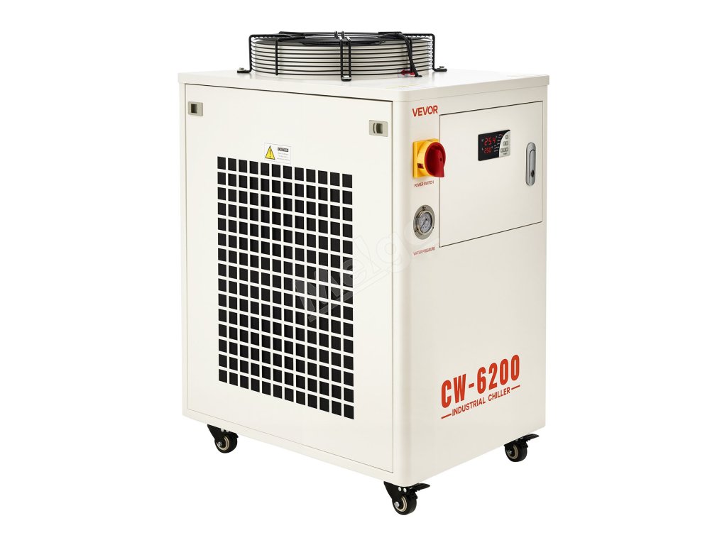 Navrhnutý s výkonným kompresorom a vodným čerpadlom na rýchle odvádzanie tepla a udržanie stabilnej prevádzky laserových gravírovacích strojov a CNC strojov. Vďaka režimu konštantnej teploty, inteligentnému režimu ovládania a viacerým alarmovým ochranným funkciám je ideálny na chladenie jednej 450 W alebo dvoch 200 W laserových trubíc.