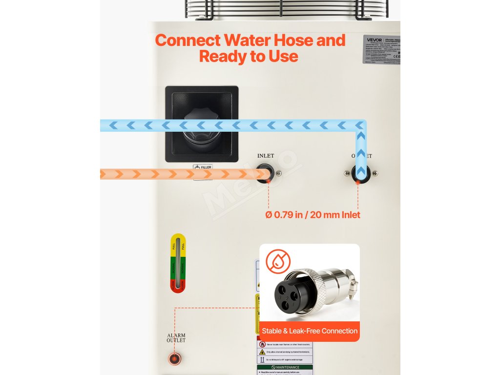 Náš priemyselný laserový chladiaci agregát má štandardné priemerové vstupné a výstupné otvory, ktoré sú kompatibilné s väčšinou laserových gravírovacích strojov, CNC strojov a iných priemyselných zariadení. Zabezpečuje jednoduché pripojenie bez dodatočných adaptérov.