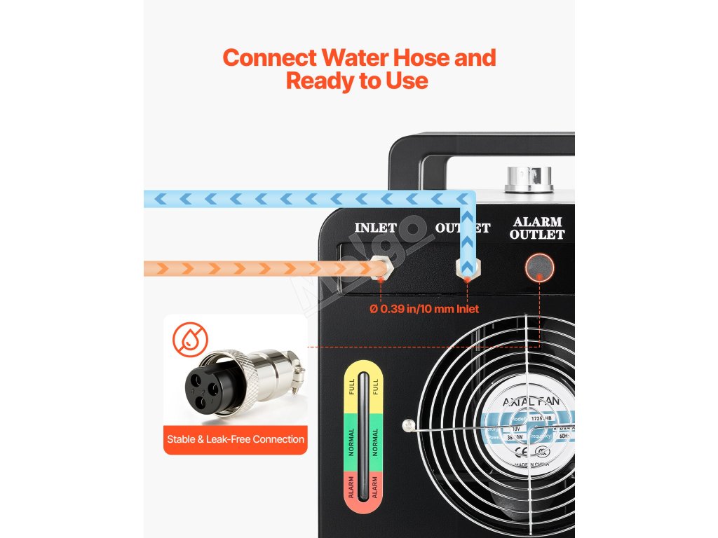 Náš priemyselný laserový chladiaci agregát má štandardné priemerové vstupné a výstupné otvory, ktoré sú kompatibilné s väčšinou laserových gravírovacích strojov, CNC strojov a iných priemyselných zariadení. Zabezpečuje jednoduché pripojenie bez dodatočných adaptérov.