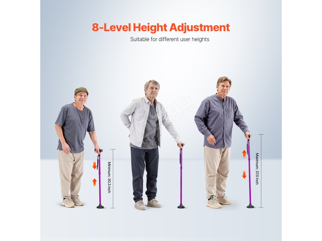 Naša vychádzková palica poskytuje výnimočnú stabilitu pre potreby každodennej mobility vďaka 4-ramennej otočnej základni, 8-stupňovej výške, skladaciemu dizajnu a nosnosti 250 kg. Jej ergonomický dizajn znižuje namáhanie rúk a umožňuje vám chodiť s ľahkosťou a istotou - ideálne pre osoby s problémami s pohyblivosťou.