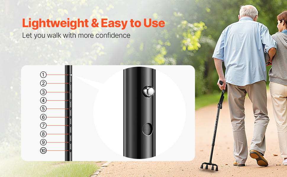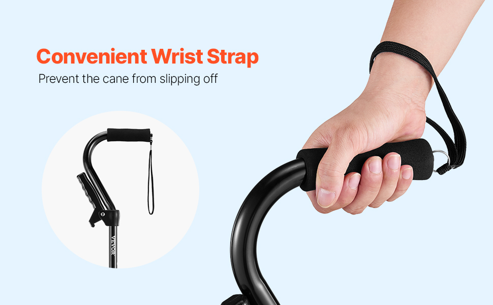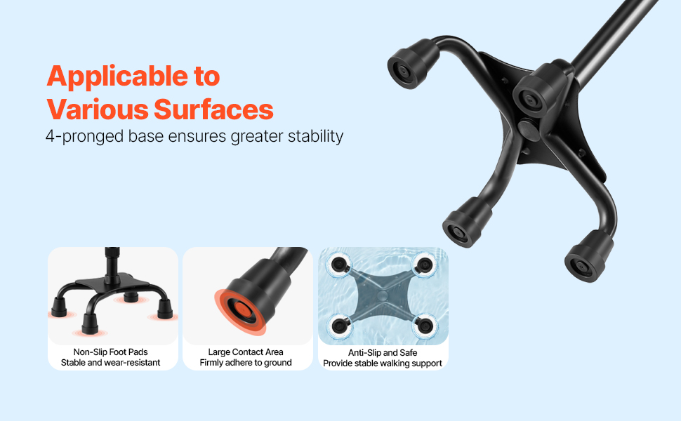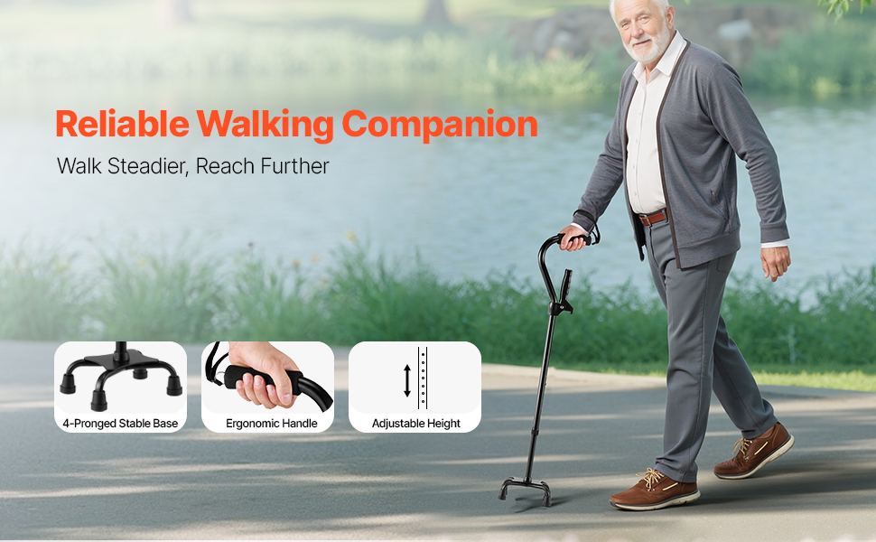 Táto vychádzková palica sa dodáva s protišmykovou štvorhrannou základňou, ktorá ponúka veľký kontakt so zemou a zvýšenú trakciu na zabezpečenie stability a pohodlia pri chôdzi. Bez námahy zvláda rôzne povrchy, čím pomáha používateľom chodiť s istotou a užívať si bezpečnejšiu chôdzu.