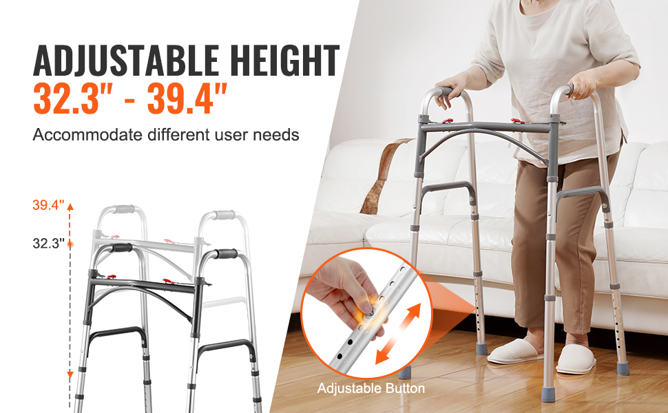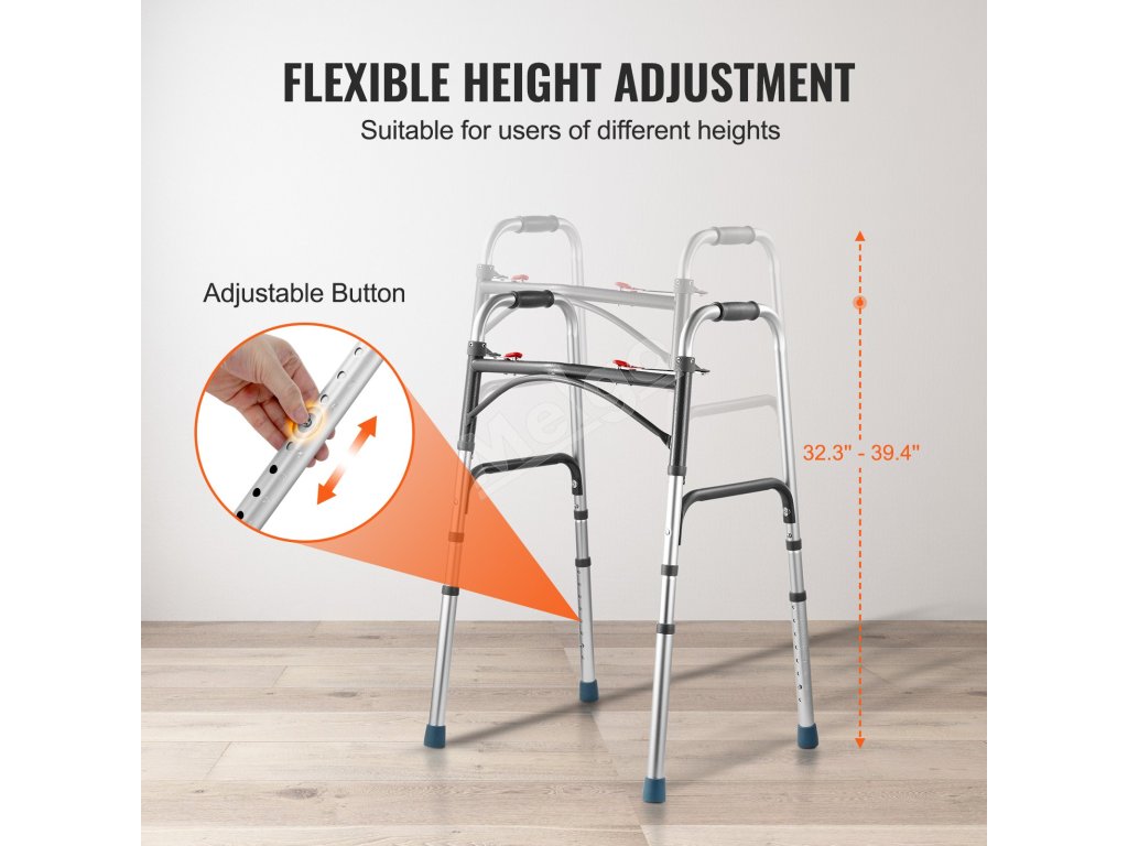 Vďaka 8-stupňovému rozsahu nastavenia výšky od 32,3 do 39,4 palca je naše hliníkové ľahké skladacie chodítko vhodné pre používateľov rôznej výšky. Prispôsobte si ho na preferovanú úroveň pre optimálne pohodlie, čím zabezpečíte, že bude dokonale vyhovovať vašim individuálnym potrebám.