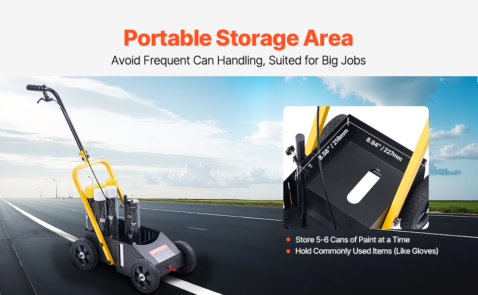 Tento stroj na vyznačovanie čiar vybavený prenosným úložným priestorom pojme naraz 5 až 6 plechoviek s farbou spolu s ďalšími základnými nástrojmi a príslušenstvom, vďaka čomu budete mať pri práci všetko potrebné na dosah.