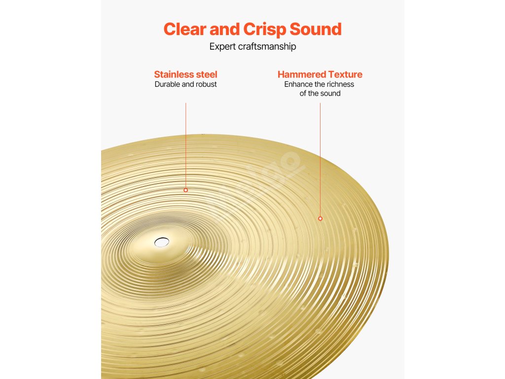 Naša sada bubeníckych činelov je vyrobená z odolnej zliatiny a má hrúbku 1 mm, čo zaručuje rýchlu odozvu a zároveň pevnosť. Drážky a kladivká zabezpečujú čistý, jasný tón, ktorý vám poskytne hladký a príjemný zážitok z hrania.