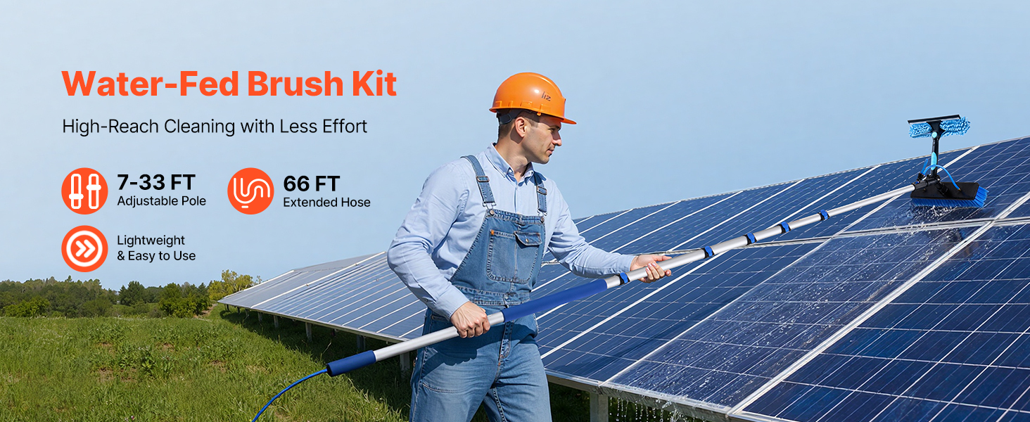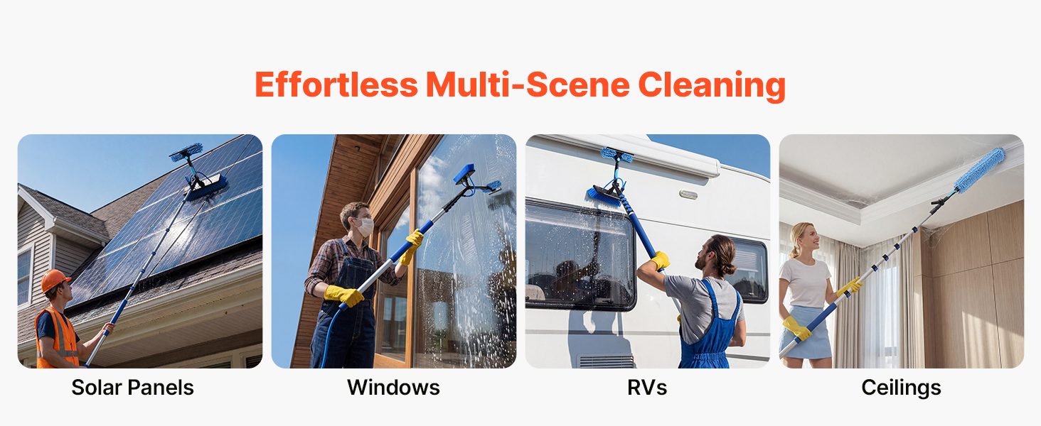 Táto multifunkčná sada kefy a tyče na čistenie solárnych panelov je vhodná pre rôzne prostredia, vrátane domovov a záhrad. Účinne čistí solárne panely, okná, stropy, zimné záhrady, karavany a billboardy.