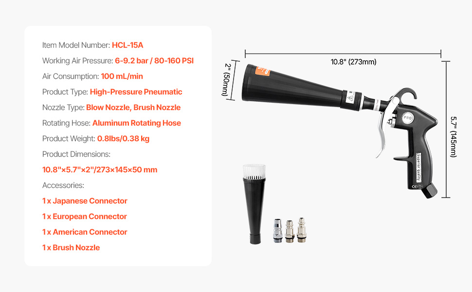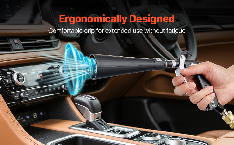 Táto všestranná čistiaca pištoľ na autá je vybavená 2 tryskami a 360° otočnou konštrukciou na hĺbkové čistenie vozidiel, s vysokotlakovou rotačnou tryskou 6-9,2 bar a energeticky úspornou spotrebou vzduchu 100 ml/min. Táto pištoľ je kompatibilná s konektormi 1/4 NPT pre rôzne vzduchové kompresory.