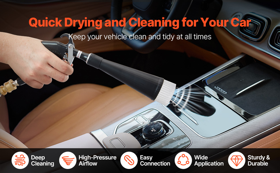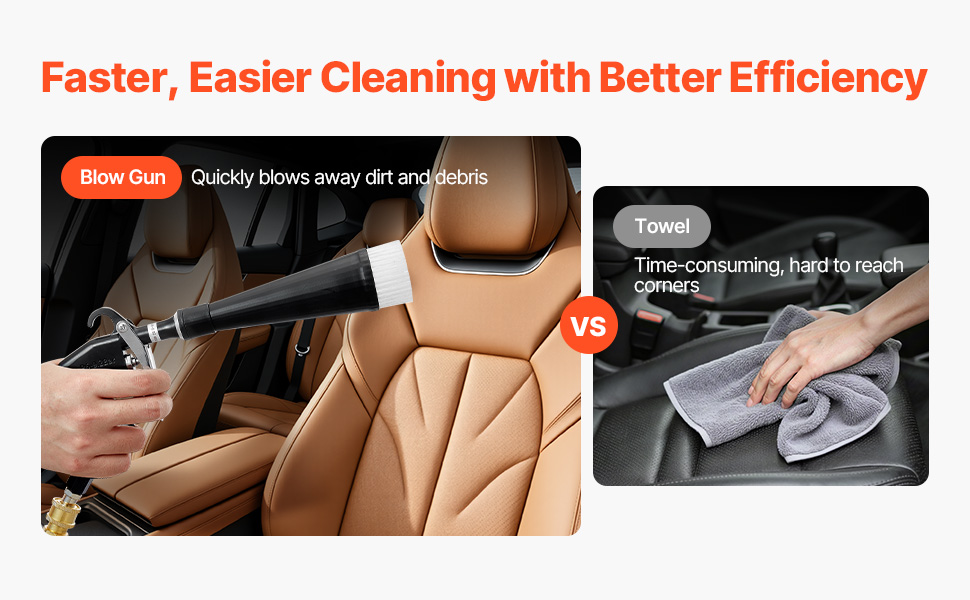 Táto vzduchová kompresorová pištoľ ľahko odfúkne nečistoty a úlomky, rýchlo vyčistí ťažko dostupné miesta a zvýši účinnosť čistenia. V porovnaní s uterákmi, ktoré sú časovo náročné a neúčinné pri čistení rohov, výrazne zvyšuje účinnosť čistenia.