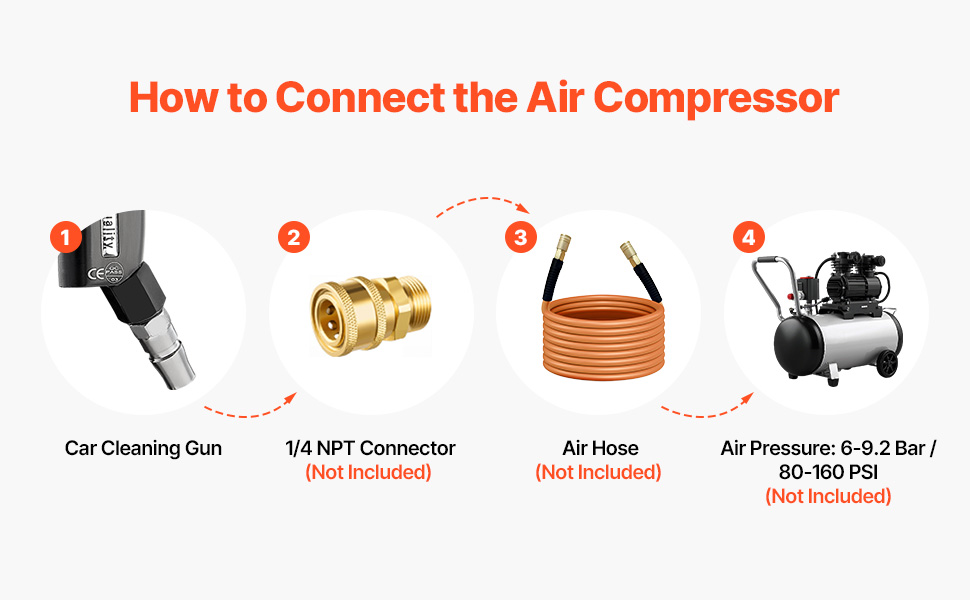 Vírivá čistiaca pištoľ sa jednoducho pripája k väčšine priemyselných vzduchových kompresorov pomocou niekoľkých jednoduchých krokov. Uistite sa, že rozsah tlaku vášho vzduchového kompresora je 6-9,2 bar (80-160PSI), aby ste zabezpečili optimálny čistiaci výkon. (Poznámka: Konektor 1/4 NPT a vzduchová hadica nie sú súčasťou balenia.)