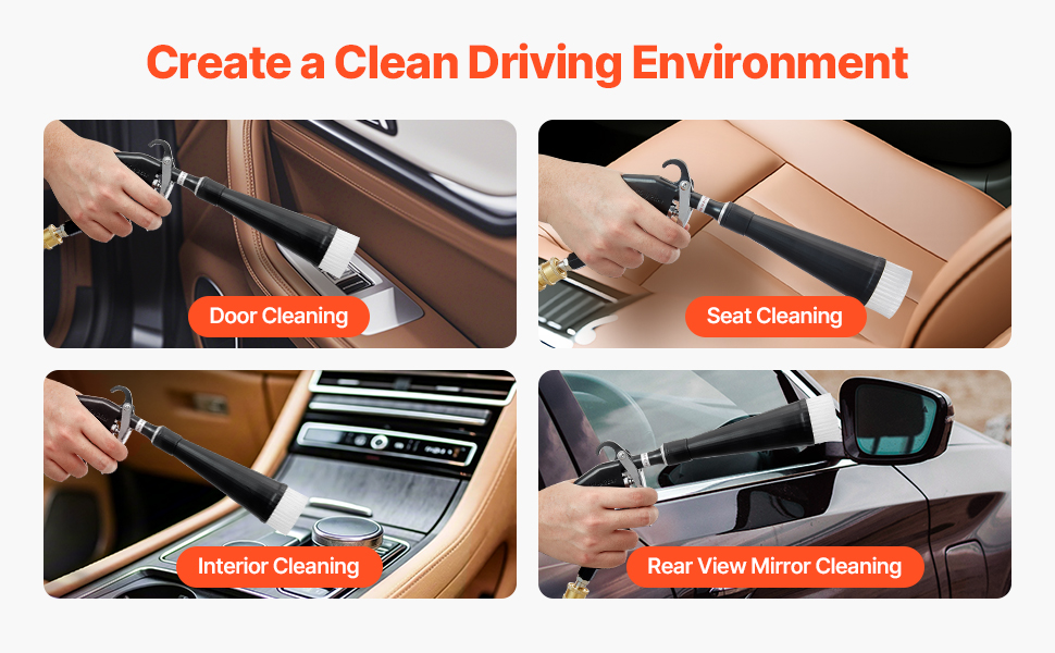 Vírivá vzduchová pištoľ spĺňa rôzne potreby čistenia a ľahko si poradí s úlohami, ako je čistenie dverí, sedadiel, interiéru a spätných zrkadiel automobilov. Rýchlo odstraňuje odolné škvrny a čistí ťažko prístupné rohy, vďaka čomu bude vaše auto vyzerať ako nové.