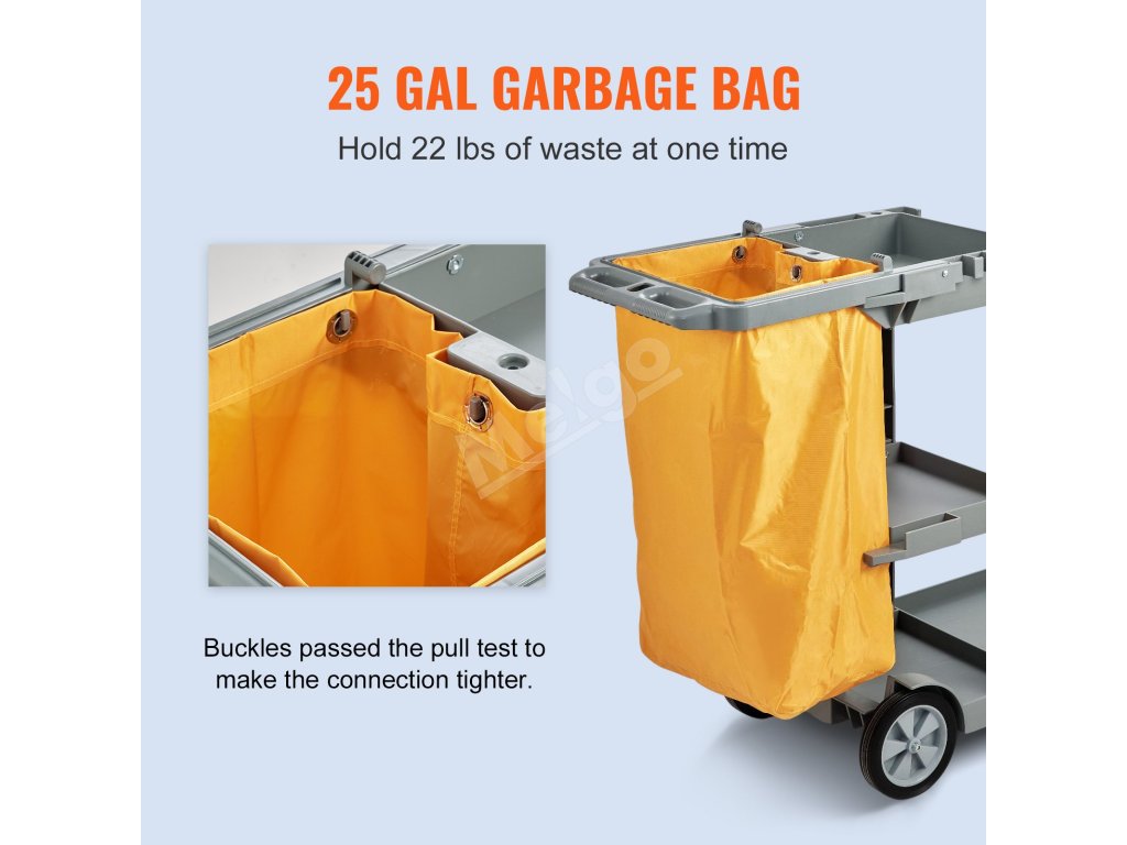 Vozík na upratovanie VEVOR je vybavený silným PVC vrecom na odpadky. Toto vrece má stúpajúcu kapacitu 25 galónov. Pojme až 22 kg odpadu. Vrecko je odolné a len tak ľahko sa neroztrhne. Zapínacie krúžky sú pevné a spoľahlivé. Vrecko môžete zavesiť na vozík a začať ho používať. Vďaka tejto funkcii je likvidácia odpadu rýchla a bezproblémová. Materiál z PVC sa tiež ľahko čistí. Vrecko tak môžete udržiavať hygienické aj pri opakovanom používaní.