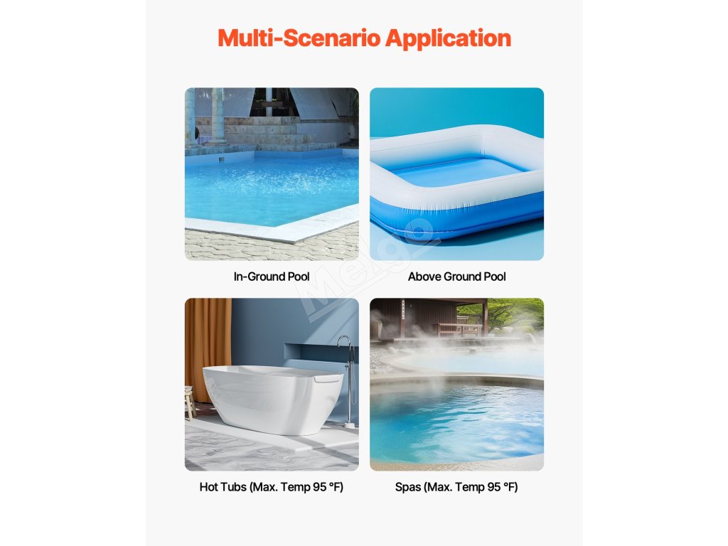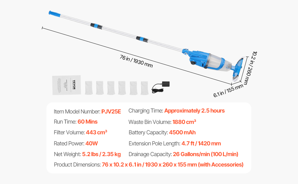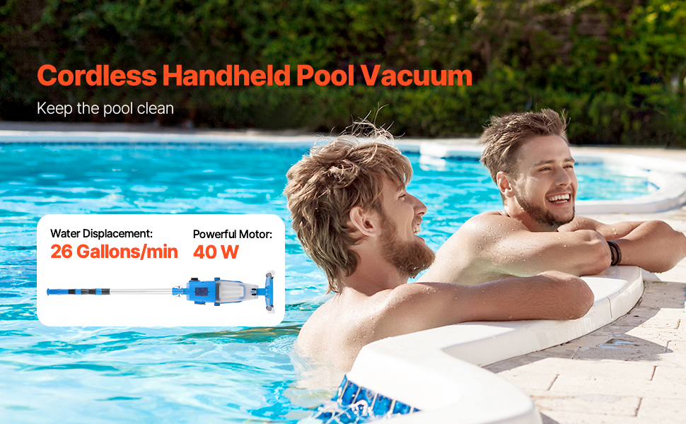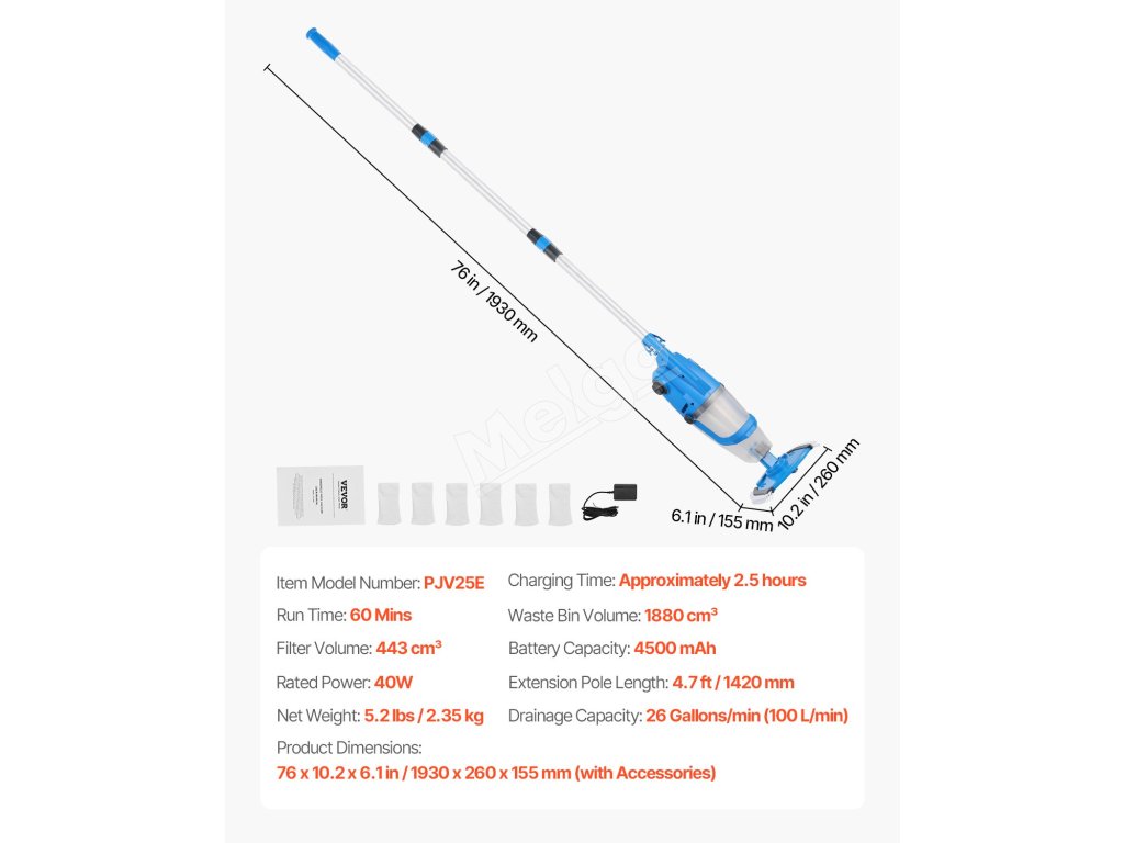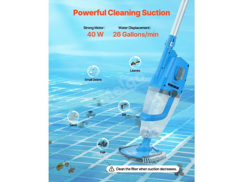 Tento bezdrôtový vysávač do vírivky je vybavený výkonným 40W motorom s prietokom 26 galónov/min, ktorý účinne odstraňuje nečistoty, piesok a zvyšky z dna bazéna (okrem rias).