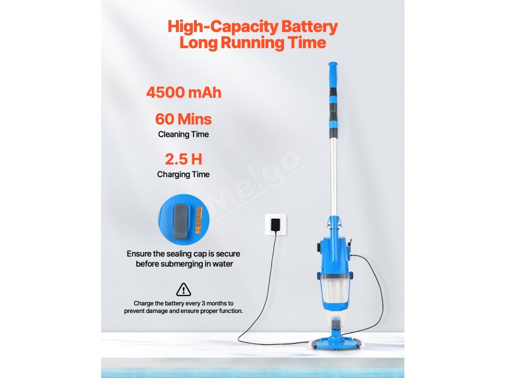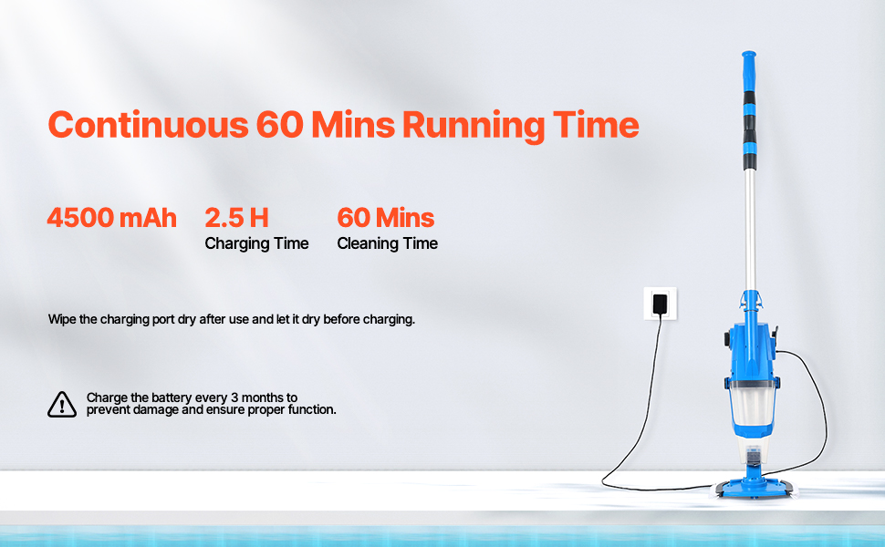 Vďaka zabudovanej 4500mAh batérii poskytuje tento nabíjateľný bazénový vysávač až 60 minút prevádzky na plné nabitie, čo vám dáva dostatok času na vyčistenie celého bazéna bez problémov s napájacími káblami.