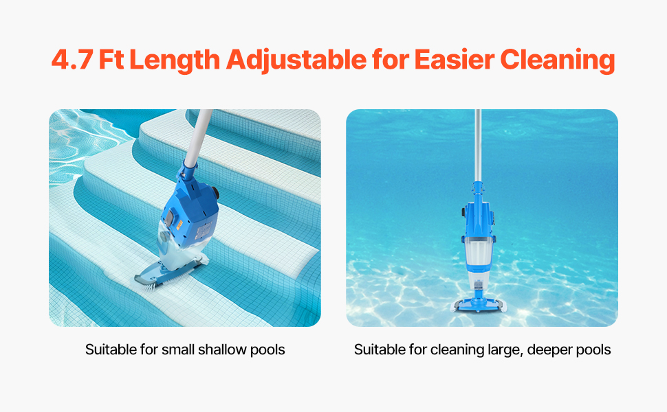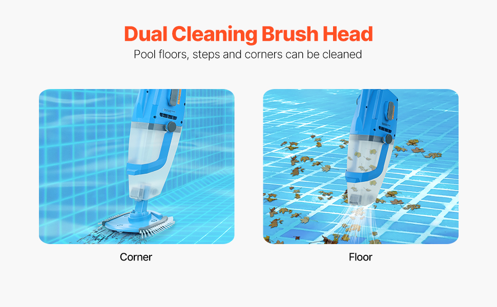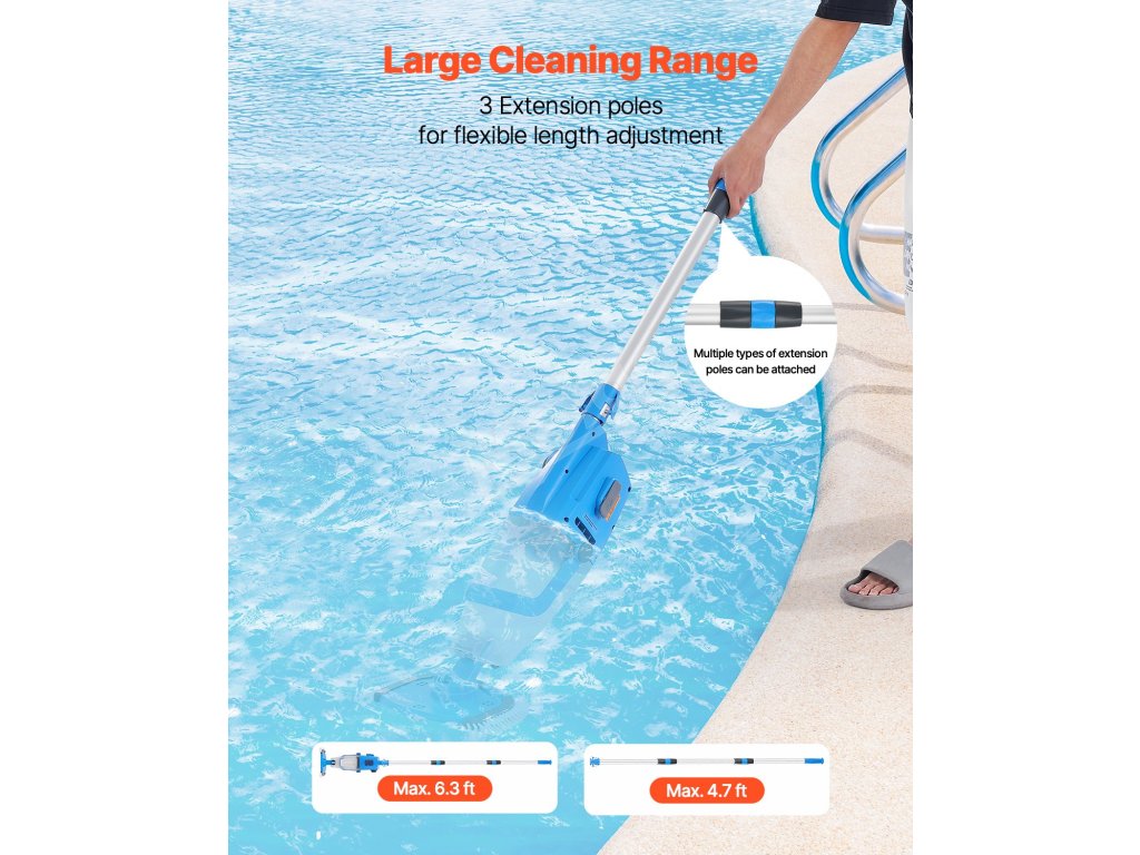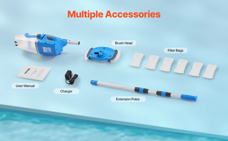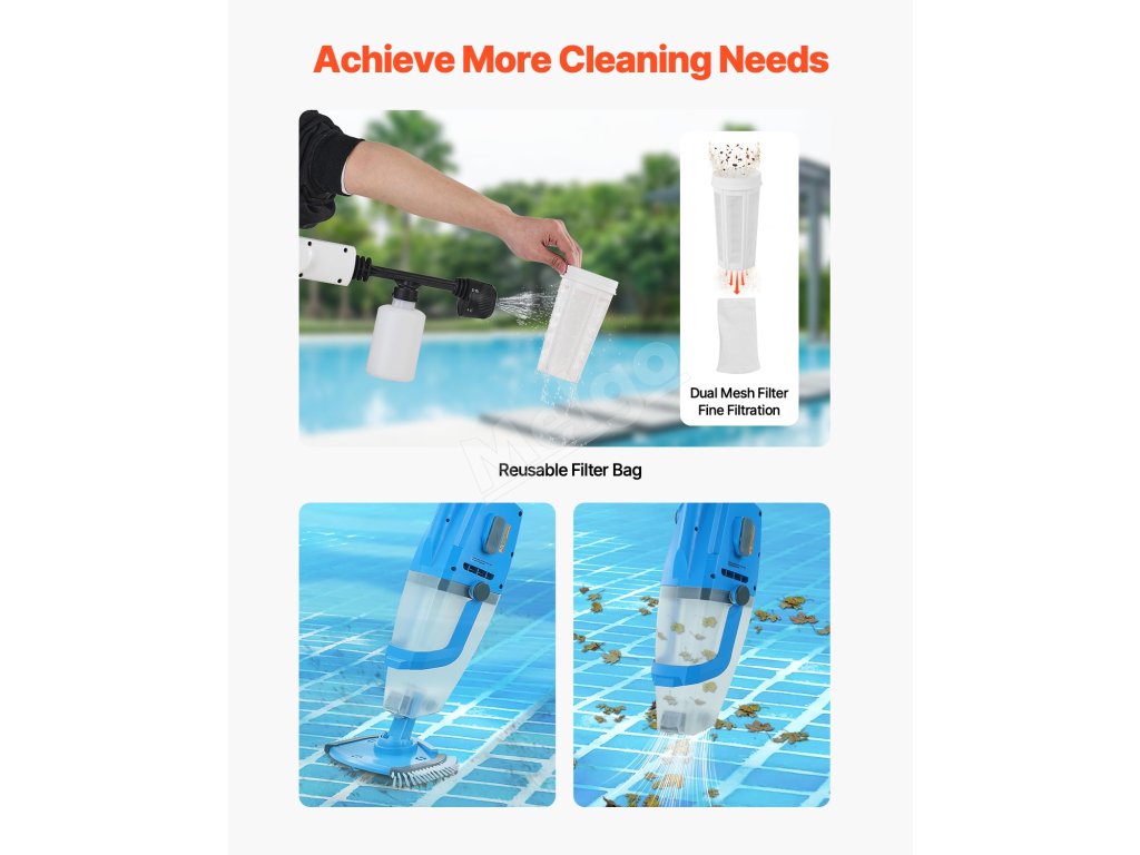 Tento nabíjateľný bazénový vysávač sa dodáva s viacerými druhmi príslušenstva, takže je ideálny pre nadzemné bazény, vírivky, kúpele, fontány, akvária, schody, steny a ďalšie.