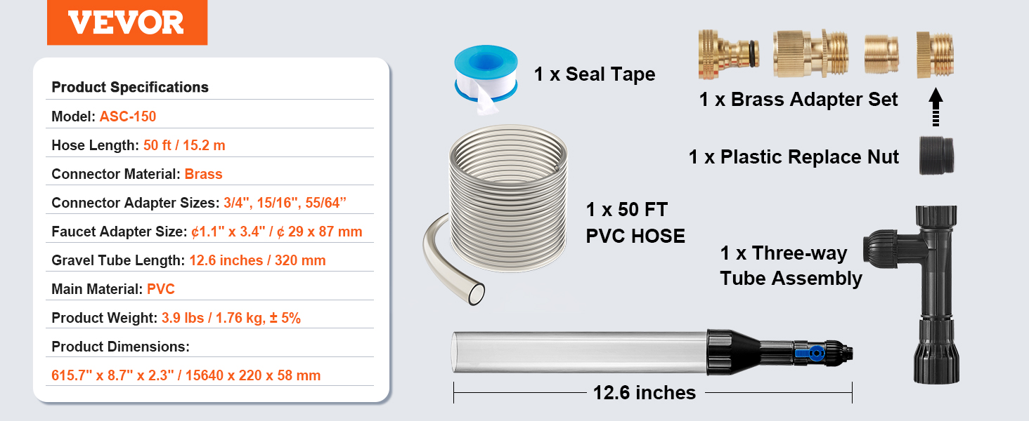 Akvarijný sifónový vysávač štrku pvc hadica 50 ft, 3 mosadzné adaptéry