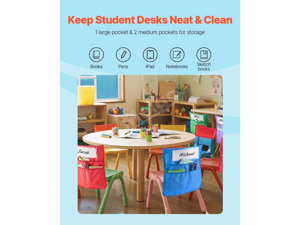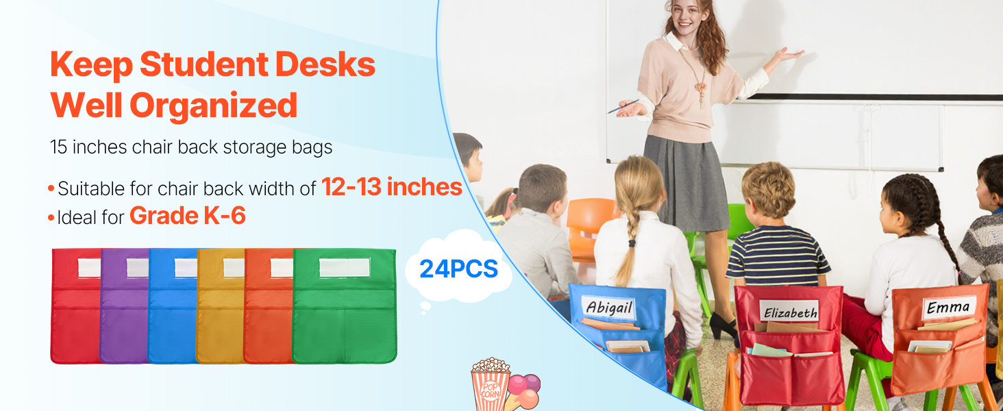 Udržujte poriadok na písacích stoloch s našimi vreckami na opierky stoličiek! Táto 24-dielna súprava je vhodná do tried a je skvelým darčekom. Hodí sa na stoličky s priemerom 12-13 palcov, ideálne pre žiakov triedy K-6, aby si udržali poriadok.