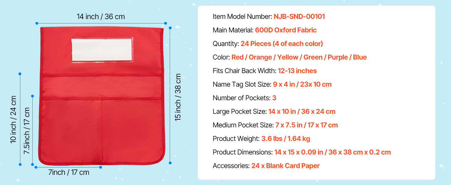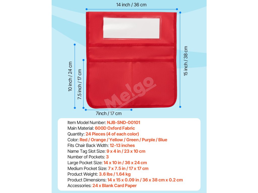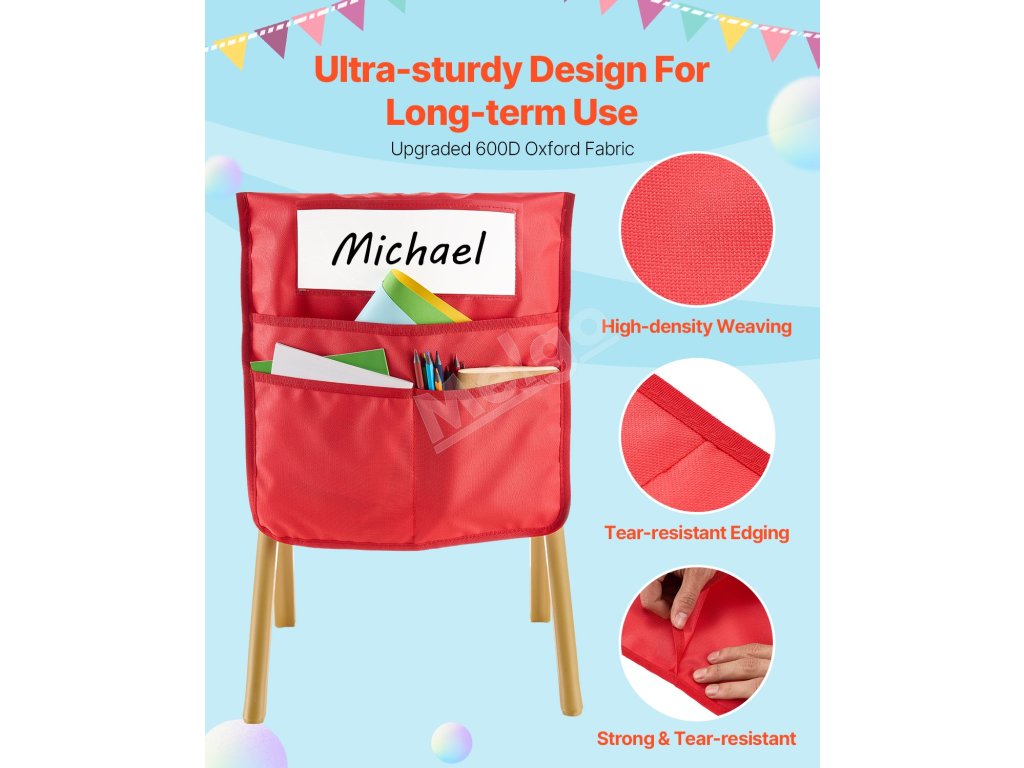 Vreckár pre žiakov na stoličke je vyrobený z tkaniny Oxford 600D s vysokou hustotou a vylepšenými okrajmi pre trvalú odolnosť. Možno ho prať v práčke - používajte ho opakovane bez opotrebovania.