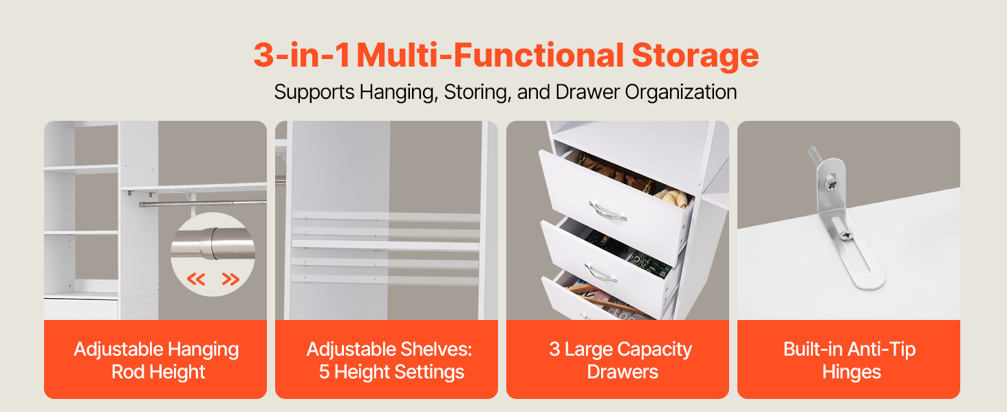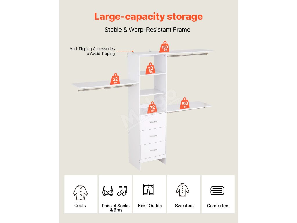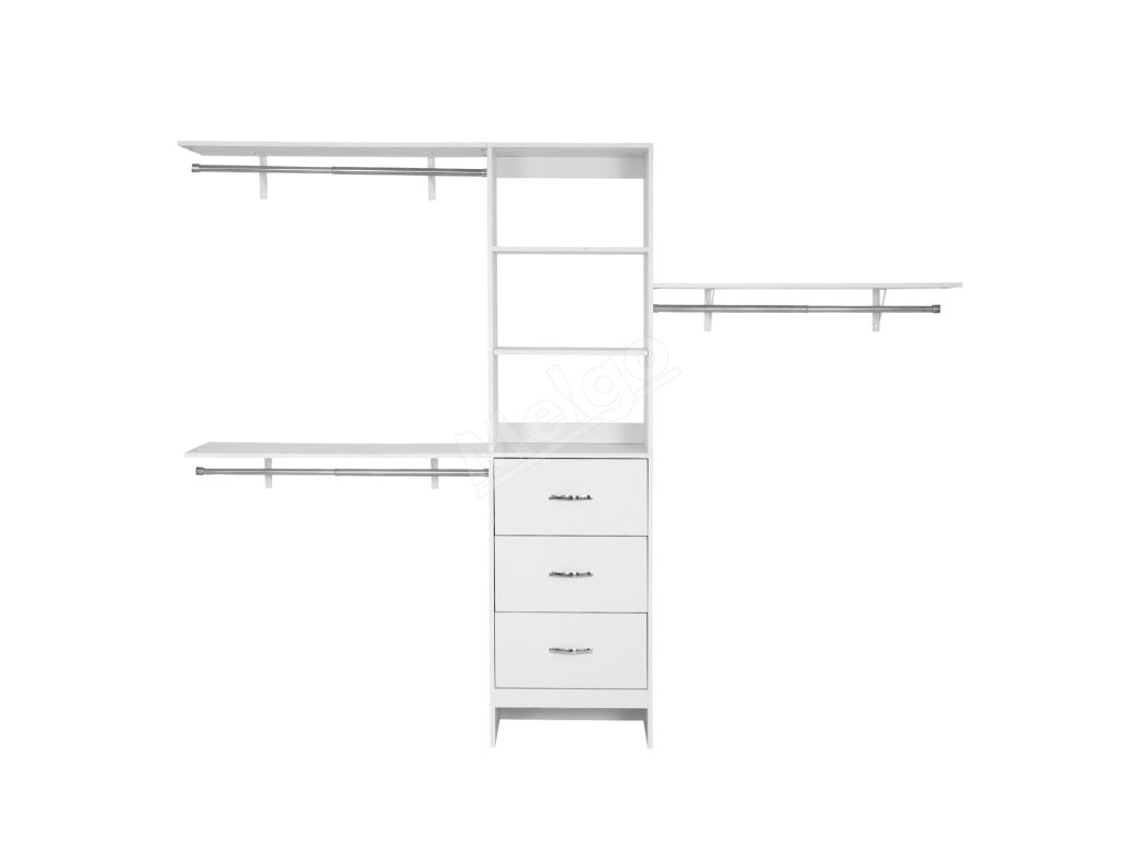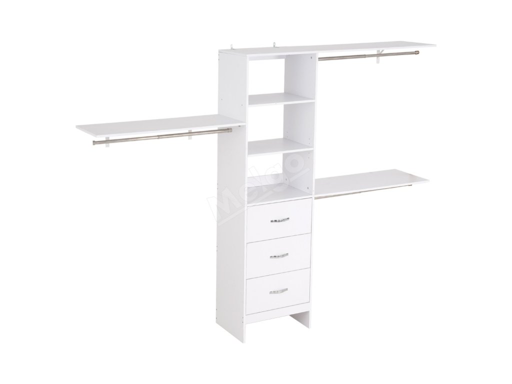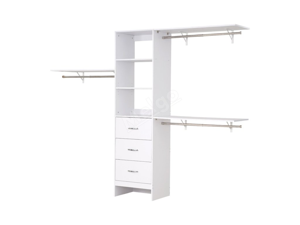 Voľne stojaci šatník, 3 zásuvky, výškovo nastaviteľný, 3 tyče, biely