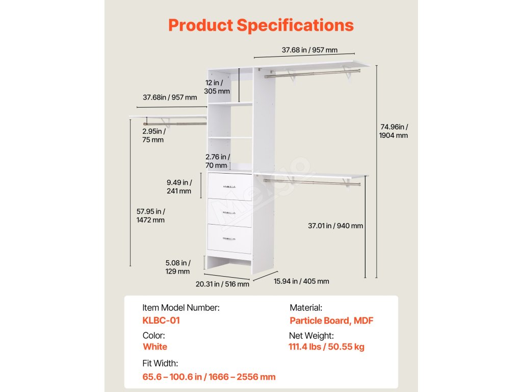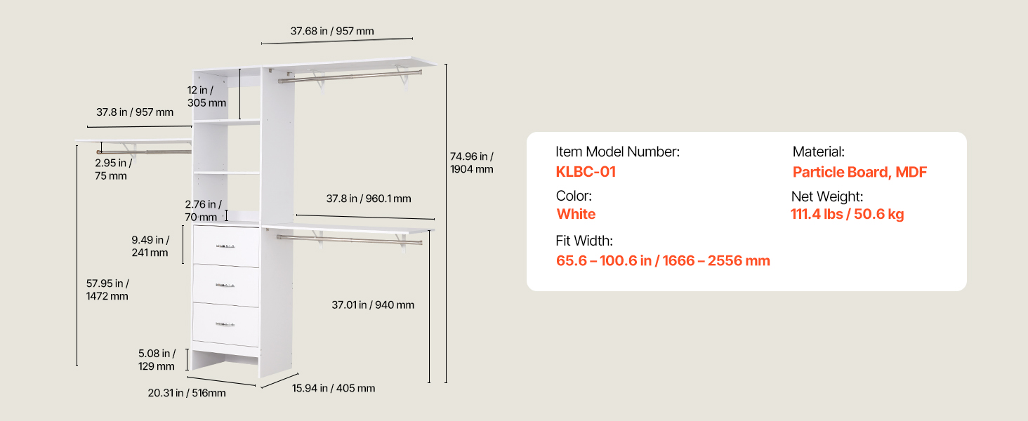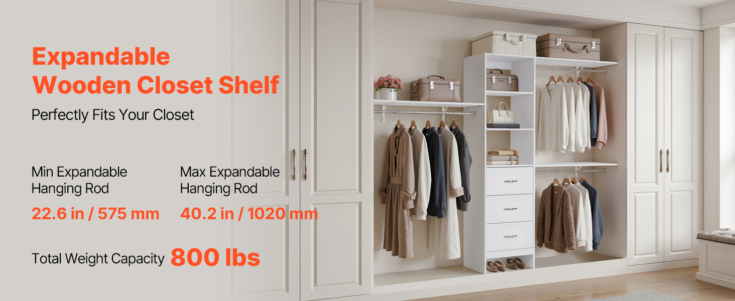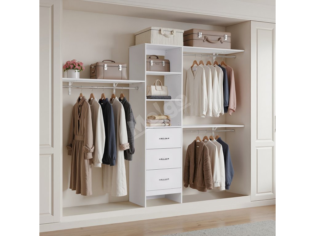 Tento rozkladací šatníkový systém so zásuvkami je určený na skladovanie v malom priestore. Jeho šírka sa voľne prispôsobuje rôznym veľkostiam skríň, čo umožňuje bezpečnú inštaláciu bez rezania. Je vyrobený z robustnej MDF a drevotrieskovej dosky s hladkým, ľahko čistiteľným povrchom a vyznačuje sa minimalistickým dizajnom, ktorý je praktický a štýlový zároveň. Je ideálny ako vrstvený regál v spálňach alebo úložných priestoroch, zlepšuje organizáciu skriniek a udržiava predmety prehľadne usporiadané.