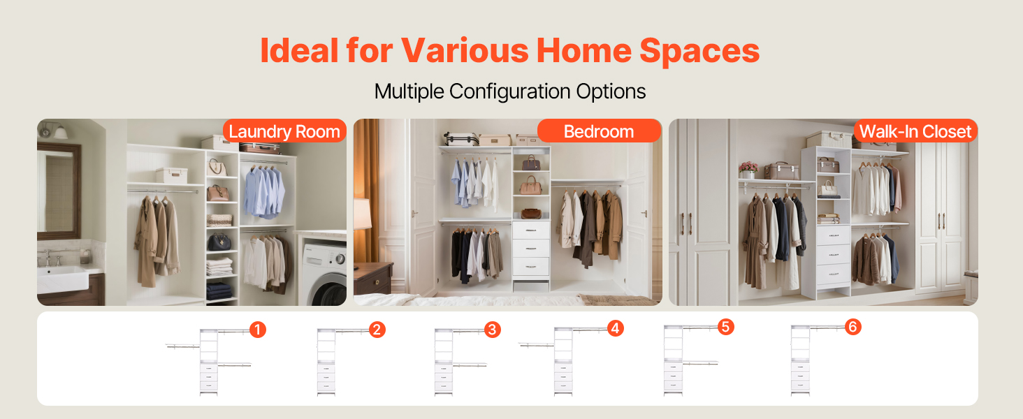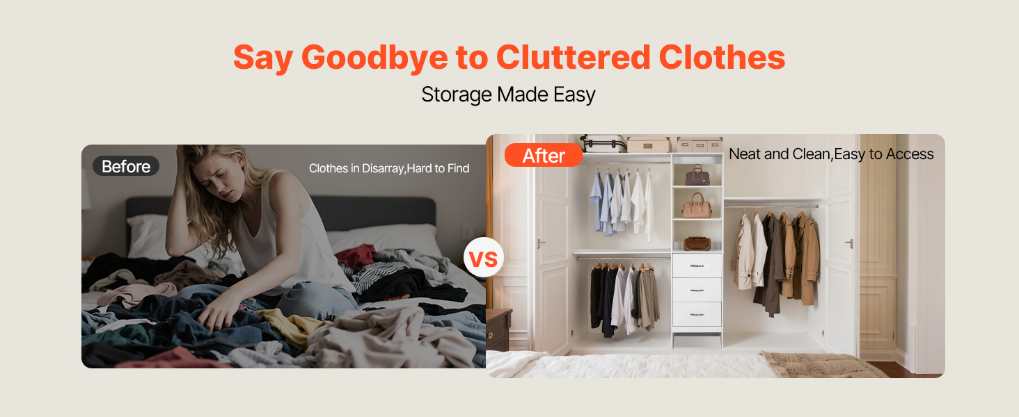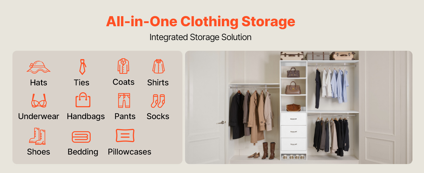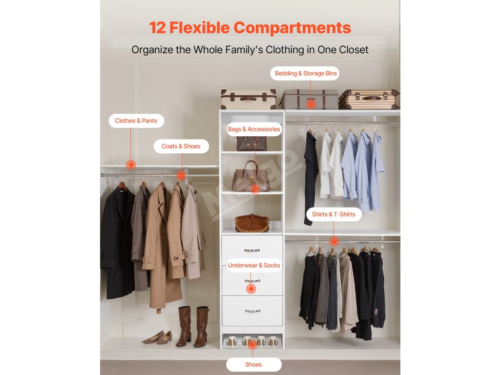 Tento rozkladací šatníkový systém so zásuvkami je určený na skladovanie v malom priestore. Jeho šírka sa voľne prispôsobuje rôznym veľkostiam skríň, čo umožňuje bezpečnú inštaláciu bez rezania. Je vyrobený z robustnej MDF a drevotrieskovej dosky s hladkým, ľahko čistiteľným povrchom a vyznačuje sa minimalistickým dizajnom, ktorý je praktický a štýlový zároveň. Je ideálny ako vrstvený regál v spálňach alebo úložných priestoroch, zlepšuje organizáciu skriniek a udržiava predmety prehľadne usporiadané.
