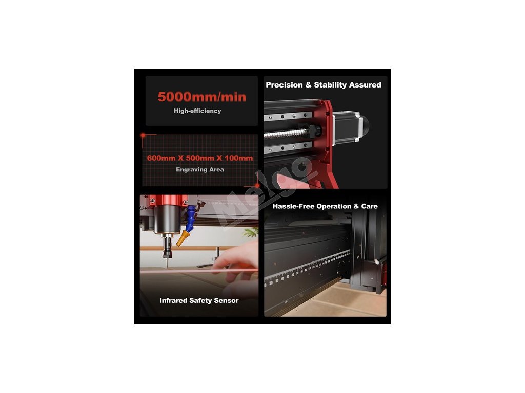 Gravírovací stroj CNC je vybavený gravírovacou plošinou s veľkou plochou 600 mm x 500 mm x 100 mm. Os X využíva profil 110 mm x 42 mm, os Y využíva profil 68 mm x 61 mm a os Z využíva profil 80 mm x 38 mm. Vďaka tejto konštrukcii je stroj robustnejší