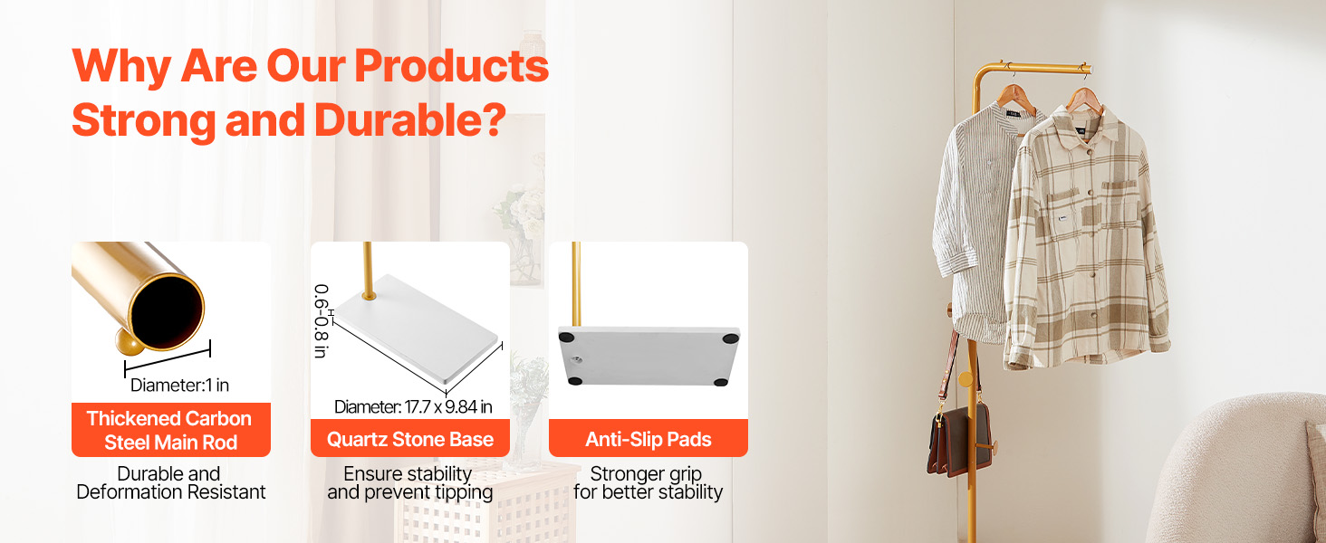 Prečo je náš voľne stojaci vešiak na šaty taký stabilný a odolný? Je vybavený zosilnenou hlavnou tyčou z uhlíkovej ocele, základňou z kremenného kameňa proti prevráteniu a protišmykovými spodnými podložkami - bezpečne udrží kabáty, tašky a klobúky, vďaka čomu sa stane nepostrádateľným doplnkom vašej domácnosti.