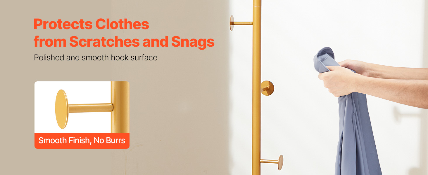 Háčiky majú hladký, zdokonalený povrch bez otrepov, čo zvyšuje celkovú estetiku stojana na kabáty a zároveň účinne chráni vaše oblečenie pred poškriabaním a poškodením. (Nosnosť jedného háčika: 6,6 libier / 3 kg ; Celková nosnosť: 22 libier / 10 kg)