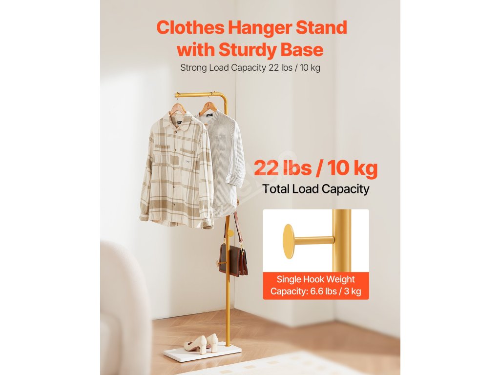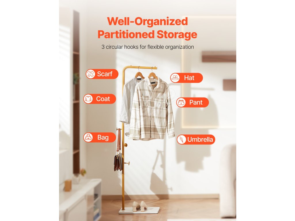 S vešiakom VEVOR budete mať kabáty, čiapky, šály a kabelky úhľadne zavesené a usporiadané. Tento štýlový vešiakový stojan na oblečenie má stabilnú základňu z kremenného kameňa, 3 odstupňované okrúhle háčiky a zosilnenú hlavnú tyč z uhlíkovej ocele - ideálny do vstupných priestorov, spální, kancelárií alebo obývacích izieb.