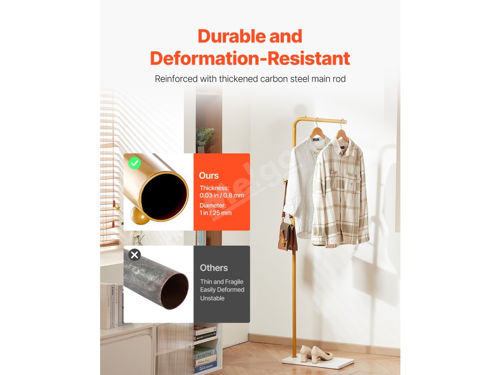 Háčiky majú hladký, zdokonalený povrch bez otrepov, čo zvyšuje celkovú estetiku stojana na kabáty a zároveň účinne chráni vaše oblečenie pred poškriabaním a poškodením. (Nosnosť jedného háčika: 6,6 libier / 3 kg ; Celková nosnosť: 22 libier / 10 kg)