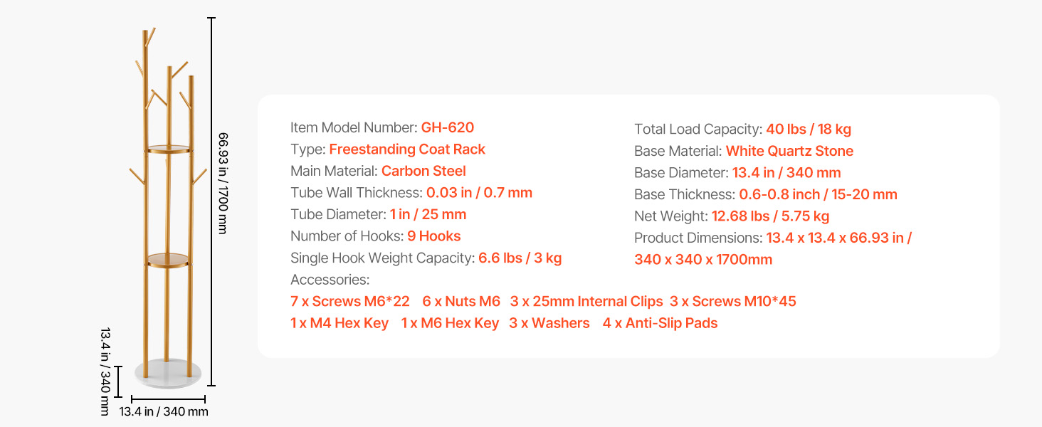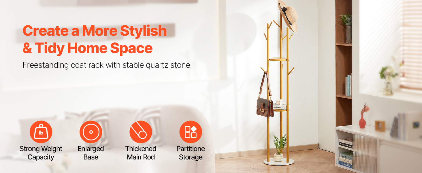 S vešiakom VEVOR budete mať kabáty, čiapky, šály a kabelky úhľadne zavesené a usporiadané. Tento štýlový vešiakový stojan na oblečenie má stabilnú základňu z kremenného kameňa, 9 šachovnicovo usporiadaných háčikov a hlavnú tyč zo zosilnenej uhlíkovej ocele - je ideálny do vstupných priestorov, spální, kancelárií alebo obývacích izieb.