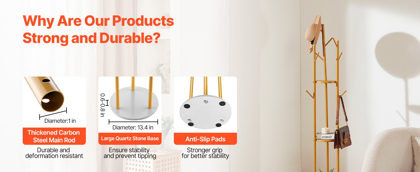 Prečo je náš voľne stojaci vešiak na šaty taký stabilný a odolný? Je vybavený zosilnenou hlavnou tyčou z uhlíkovej ocele, základňou z kremenného kameňa, ktorá je odolná proti prevráteniu, a protišmykovými spodnými podložkami - bezpečne udrží kabáty, tašky a klobúky, vďaka čomu sa stane nepostrádateľným doplnkom vašej domácnosti.