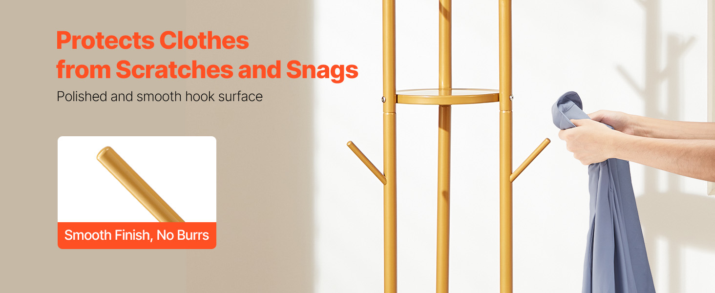 Háčiky majú hladký, zdokonalený povrch bez otrepov, čo zvyšuje celkovú estetiku stojana na kabáty a zároveň účinne chráni vaše oblečenie pred poškriabaním a poškodením. (Nosnosť jedného háčika: 6,6 libier / 3 kg ; Celková nosnosť: 40 libier / 18 kg)