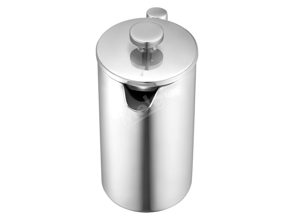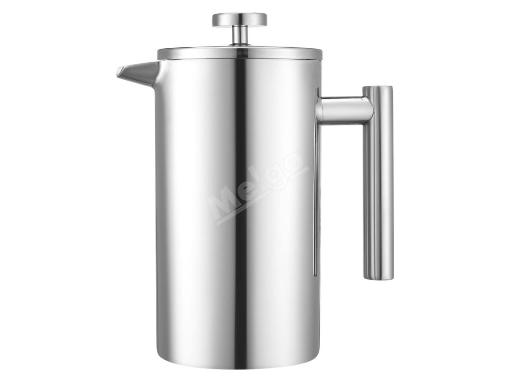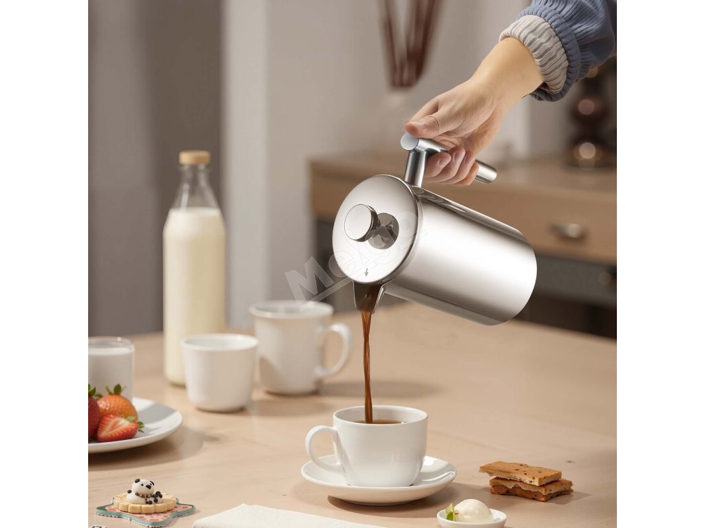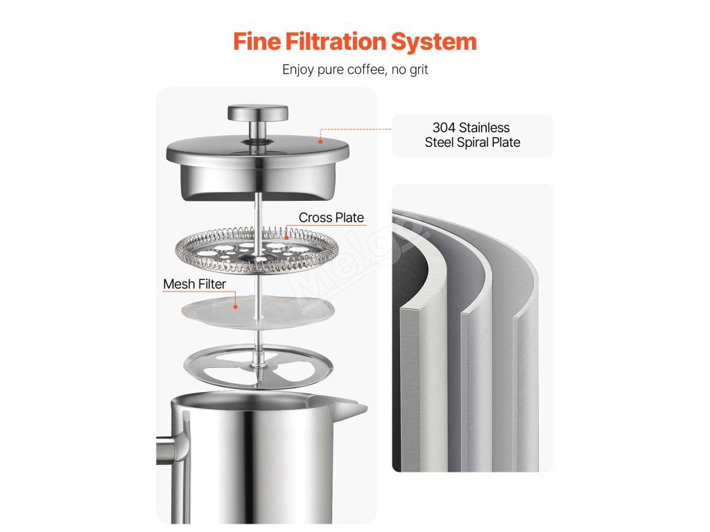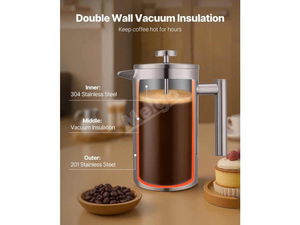 French press kávovar má dvojvrstvovú konštrukciu z nehrdzavejúcej ocele, ktorá zaručuje dlhodobú trvanlivosť a odolnosť proti hrdzi. Vákuová izolácia udržiava kávu horúcu a aromatickú, zatiaľ čo výlevka proti odkvapkávaniu zabezpečuje plynulé nalievanie.
