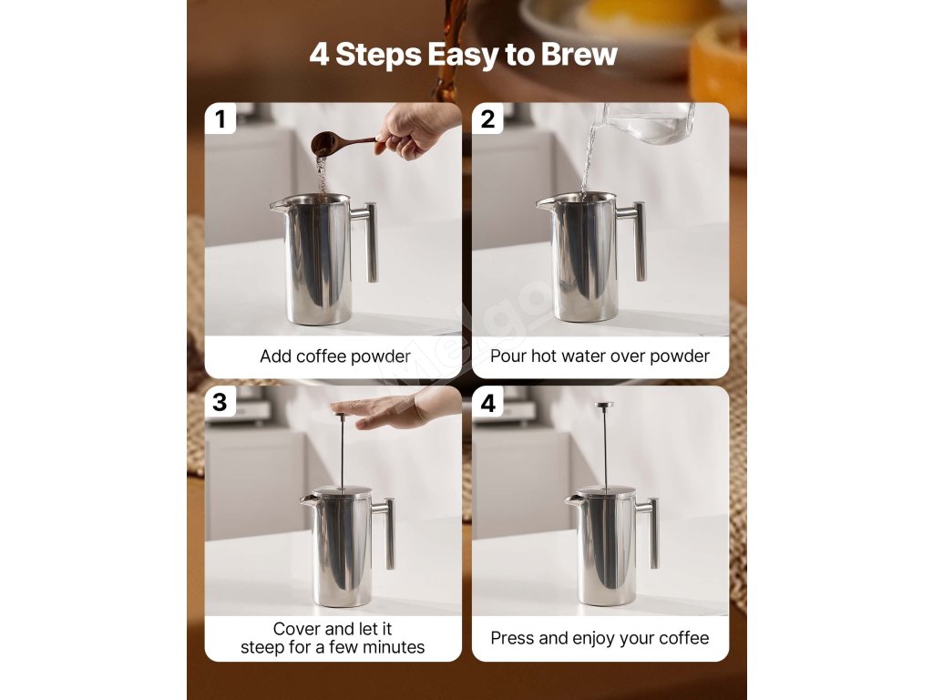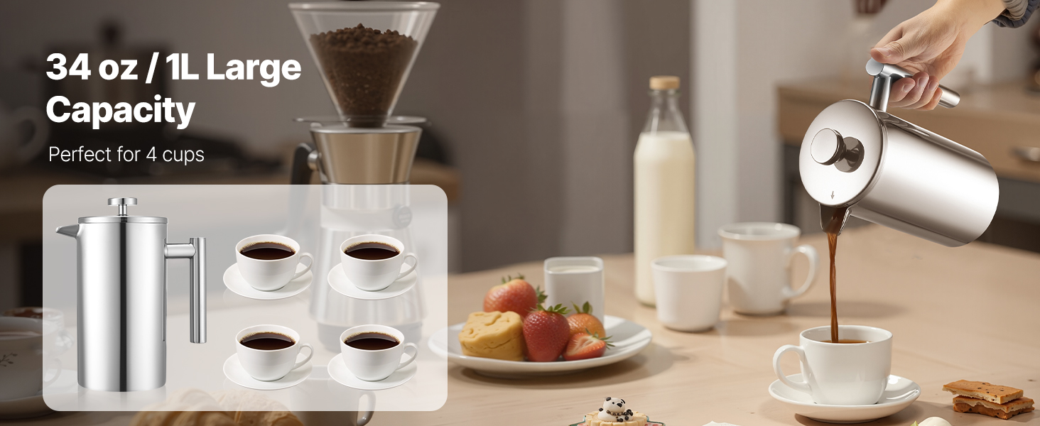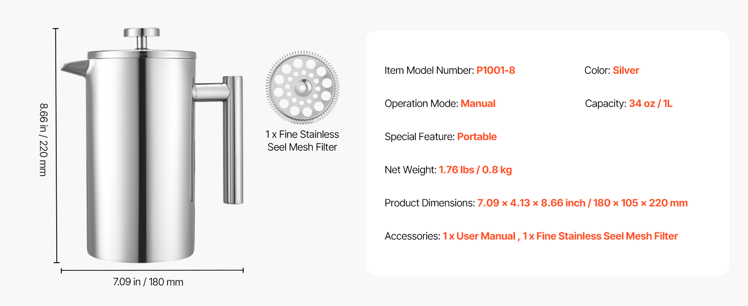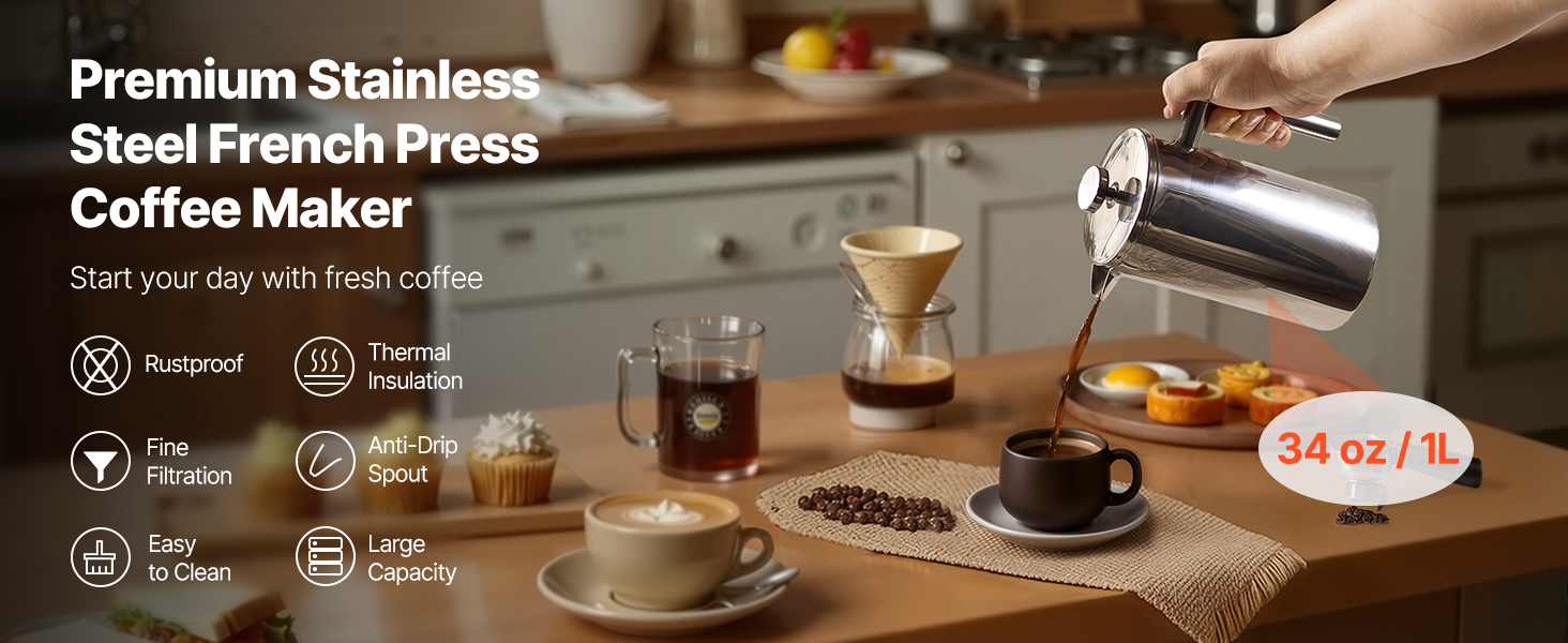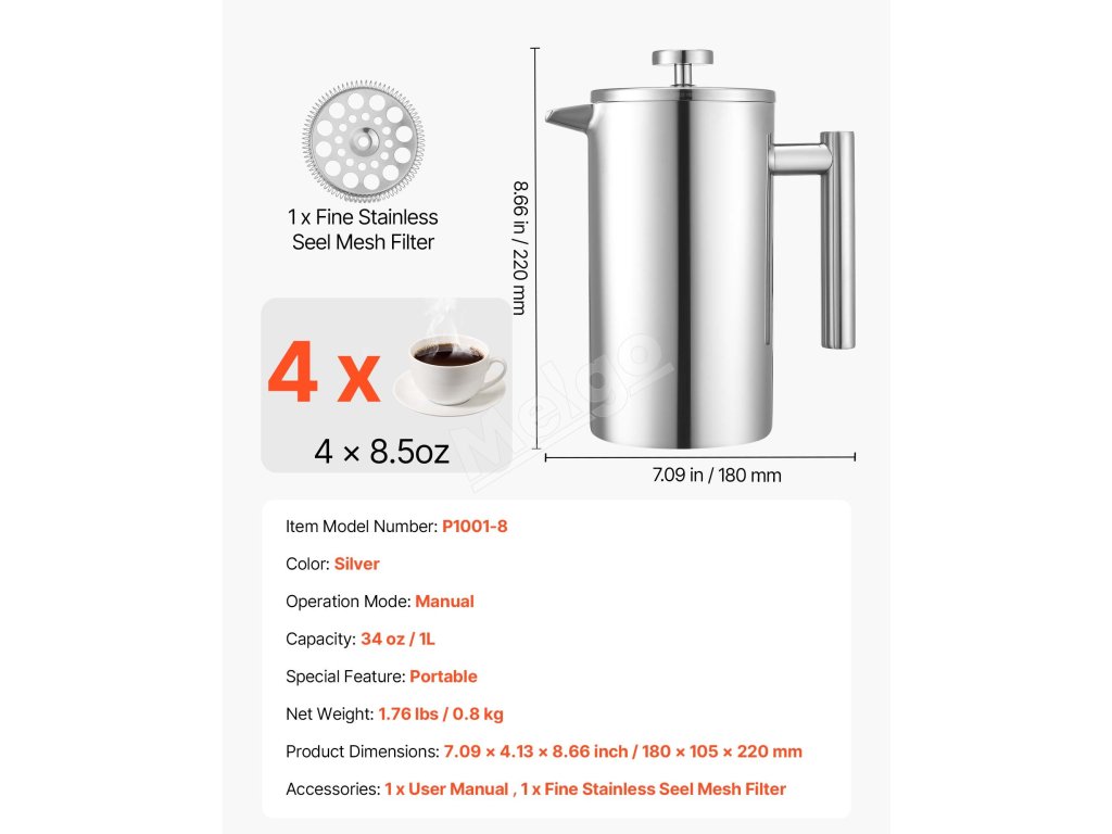 French press kávovar má dvojvrstvovú konštrukciu z nehrdzavejúcej ocele, ktorá zaručuje dlhodobú trvanlivosť a odolnosť proti hrdzi. Vákuová izolácia udržiava kávu horúcu a aromatickú, zatiaľ čo výlevka proti odkvapkávaniu zabezpečuje plynulé nalievanie.
