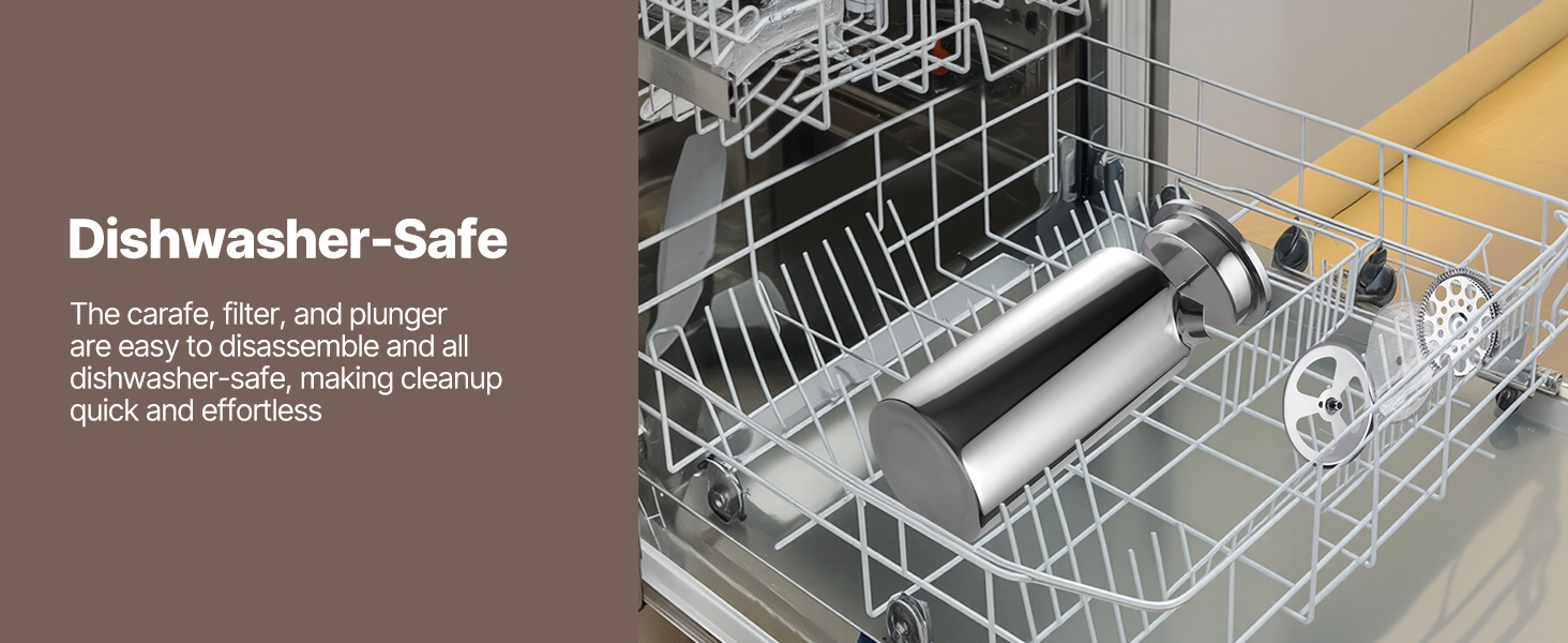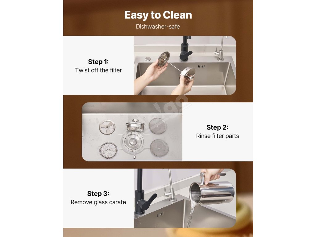Odnímateľná konštrukcia umožňuje dôkladné čistenie - stačí ju hodiť do umývačky riadu. Každá časť, od sklenenej karafy až po filter, sa dá ľahko rozobrať a nezanecháva za sebou kávu ani oleje.