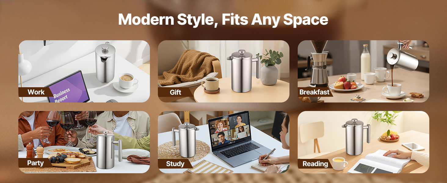 Vďaka svojmu elegantnému, nadčasovému dizajnu sa tento kávovar French press bez problémov začlení do akéhokoľvek prostredia - či už je to kancelária, kuchyňa alebo pracovňa - takže si môžete vychutnať lahodnú kávu kedykoľvek a kdekoľvek.