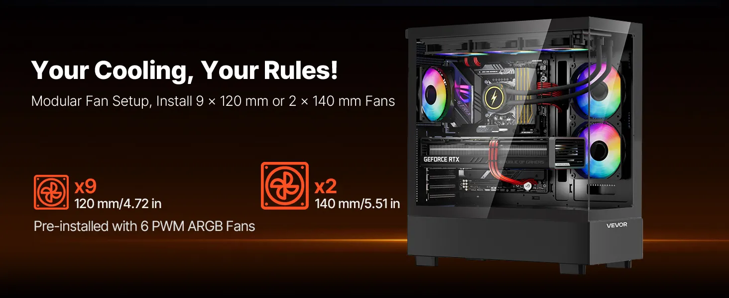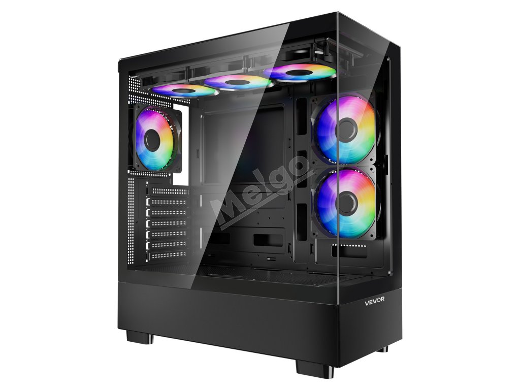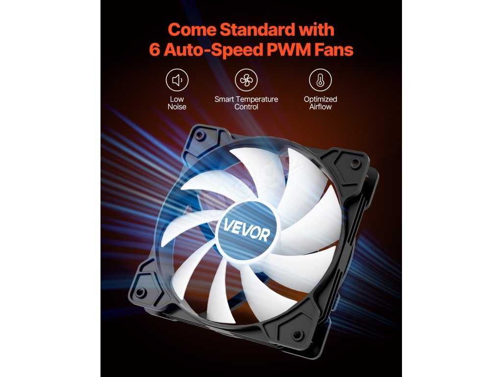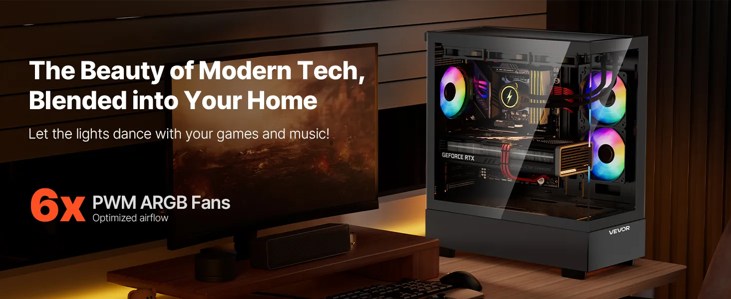 Táto skrinka je vybavená 6 x120 mm ventilátormi PWM ARGB, ktoré zaisťujú vynikajúci chladiaci výkon a zároveň vytvárajú pohlcujúcu hernú atmosféru so živými svetelnými efektmi. Je vyrobená z ocele SPCC a tvrdeného skla, je kompatibilná so základnými doskami ATX a podporuje až 2 pevné disky.