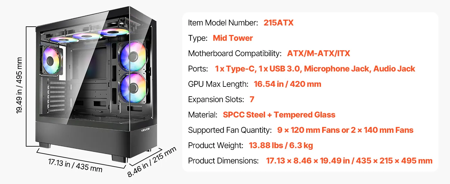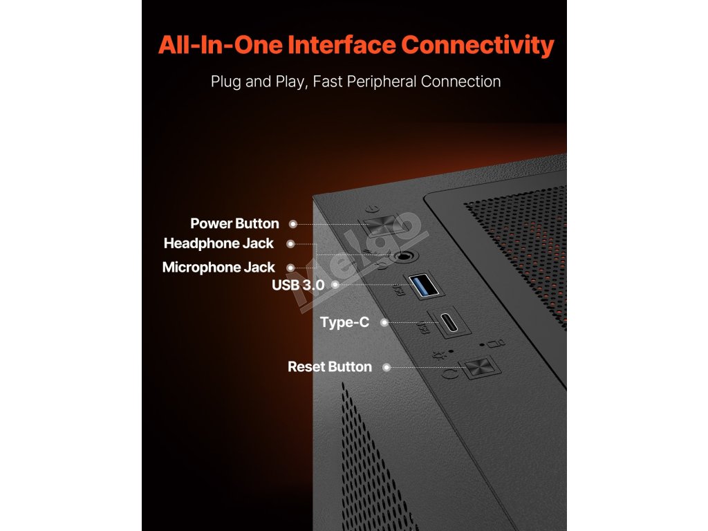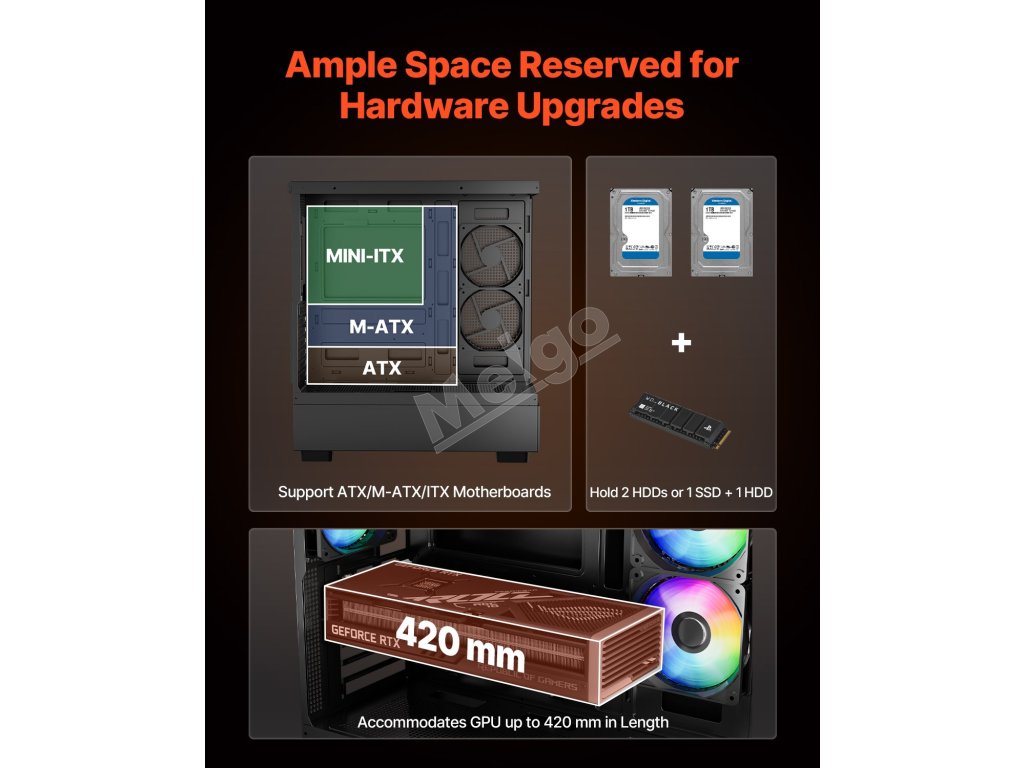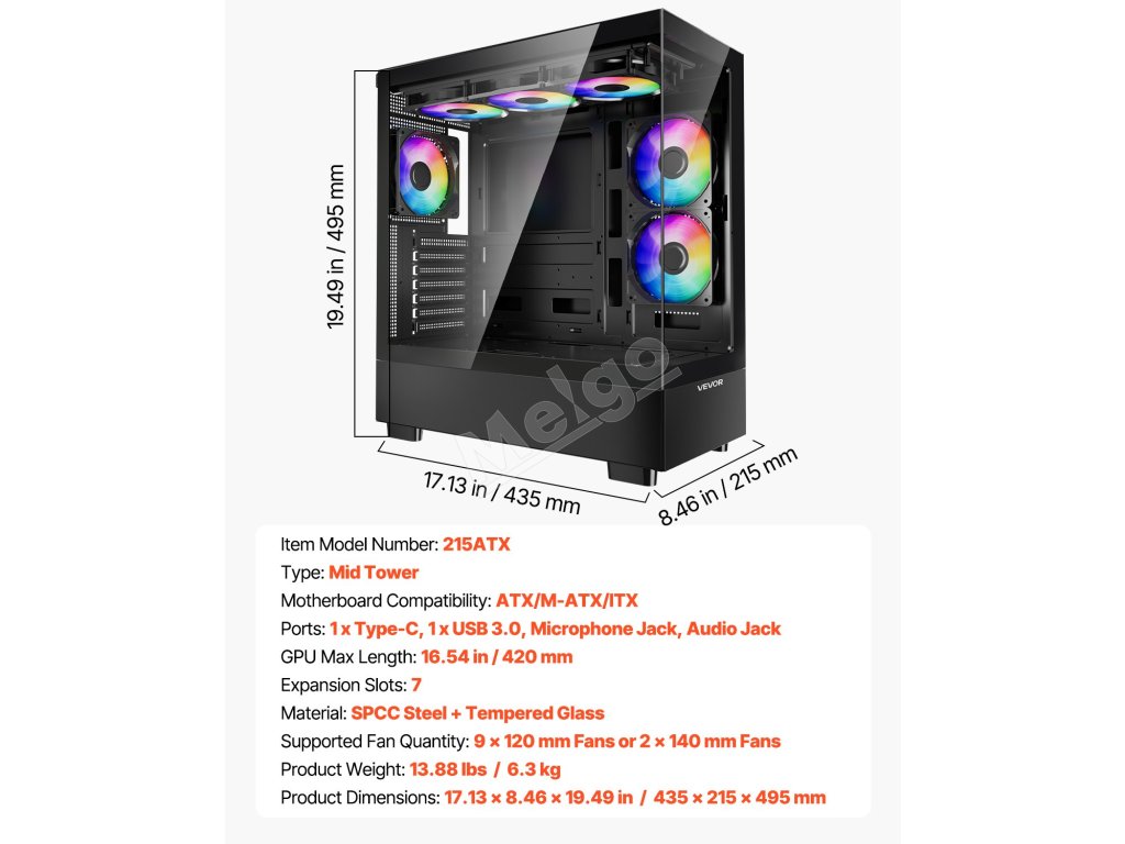 Táto skrinka je vybavená 6 x120 mm ventilátormi PWM ARGB, ktoré zaisťujú vynikajúci chladiaci výkon a zároveň vytvárajú pohlcujúcu hernú atmosféru so živými svetelnými efektmi. Je vyrobená z ocele SPCC a tvrdeného skla, je kompatibilná so základnými doskami ATX a podporuje až 2 pevné disky.