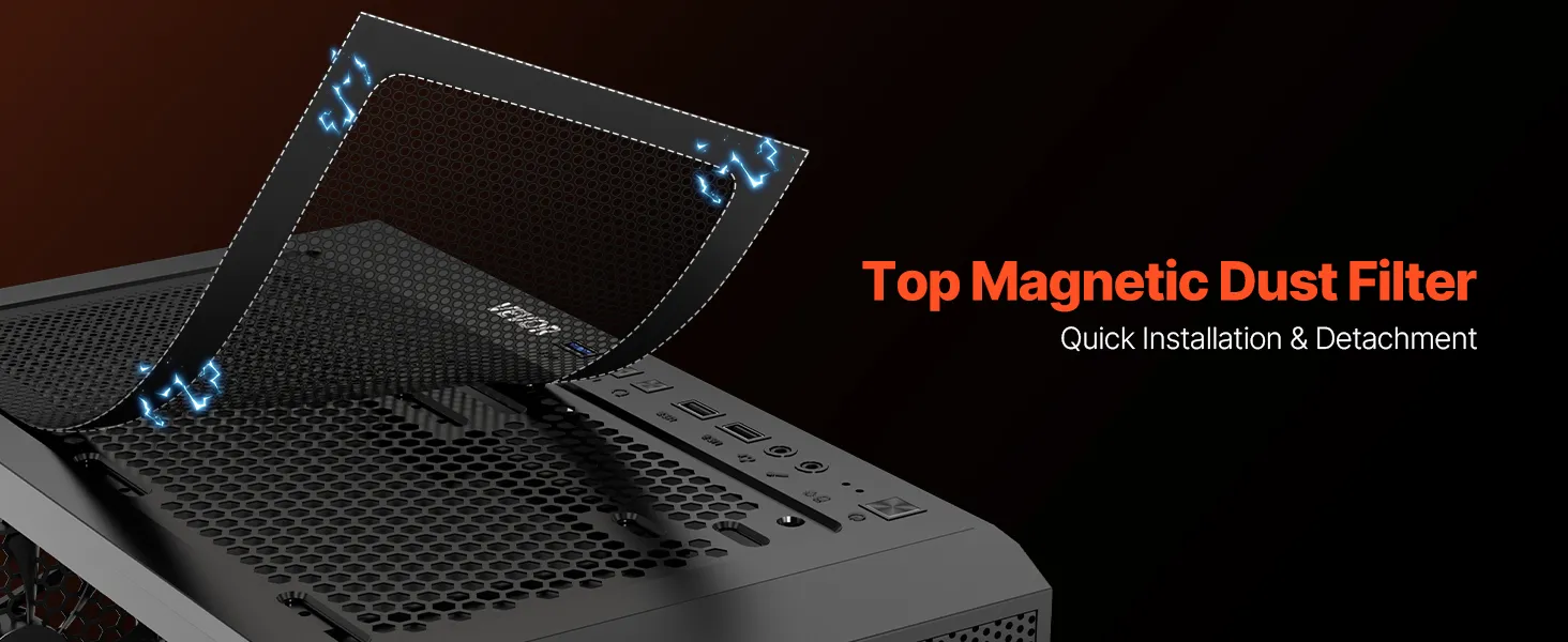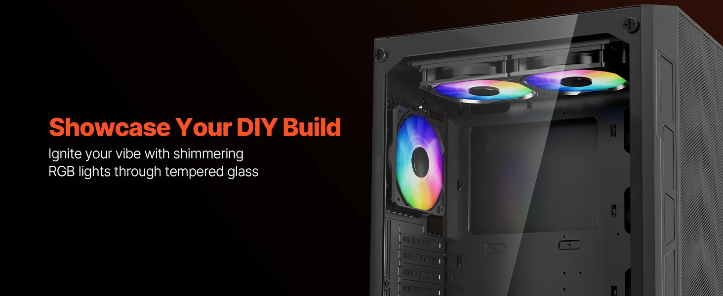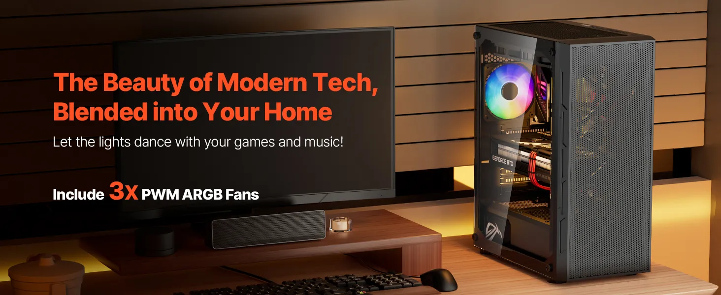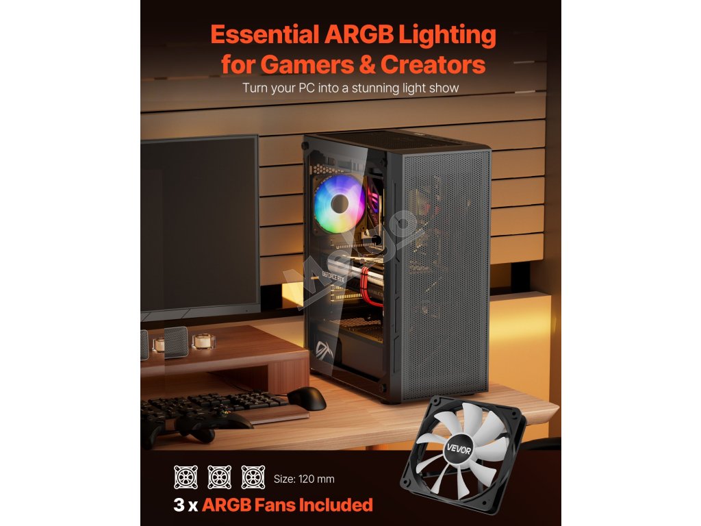 Táto skrinka je vybavená 3 x 120 mm ventilátormi ARGB, ktoré zaisťujú vynikajúci chladiaci výkon a zároveň vytvárajú pohlcujúcu hernú atmosféru so živými svetelnými efektmi. Je vyrobená z ocele SPCC a tvrdeného skla, je kompatibilná so základnými doskami ATX a podporuje až 4 pevné disky.