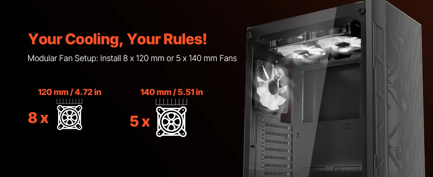 | Podporované množstvo ventilátorov | 8 x 120 mm ventilátorov, 5 x 140 mm ventilátorov |