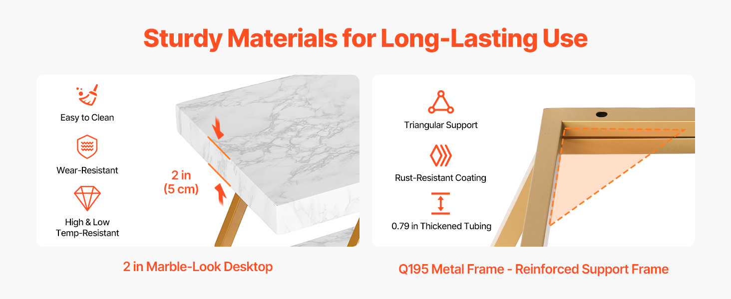 Tento stolík, vyrobený s kovovým rámom Q195, unesie až 220 libier / 100 kg, čím zabezpečuje stabilitu bez kolísania. Stolová doska z umelého mramoru je odolná proti opotrebovaniu a vyrobená tak, aby vydržala.