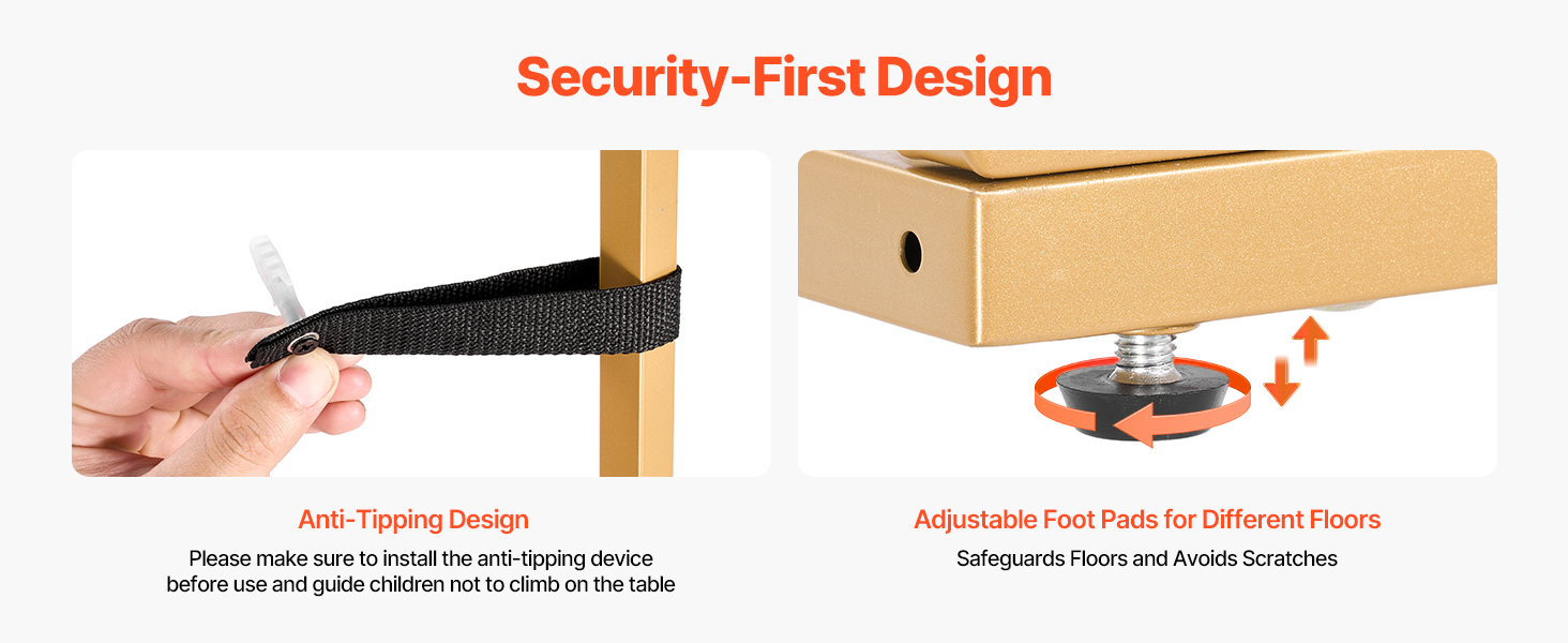 Nastaviteľné podložky pod nohy zabezpečujú stabilitu stola na nerovných podlahách a poskytujú ochranu pred poškriabaním podlahy.