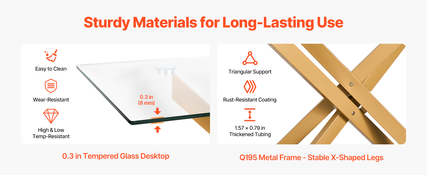 Tento stolík je vyrobený s kovovým rámom Q195, ktorý unesie až 50 libier / 22,68 kg, čo zaručuje stabilitu bez kolísania. Hrubé tvrdené sklo s vysokou priehľadnosťou je odolné proti poškriabaniu a ľahko sa utiera, takže vyzerá stále sviežo.