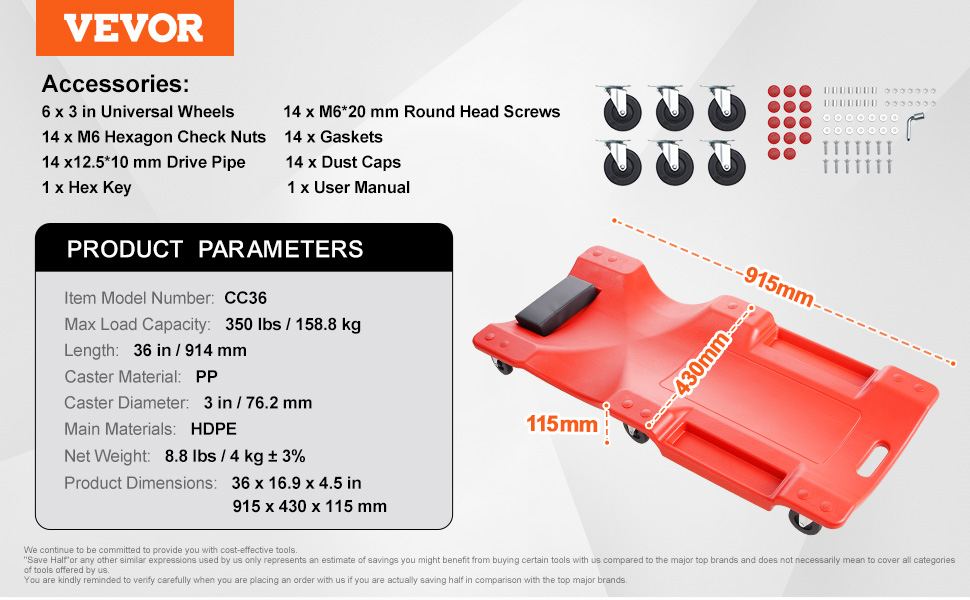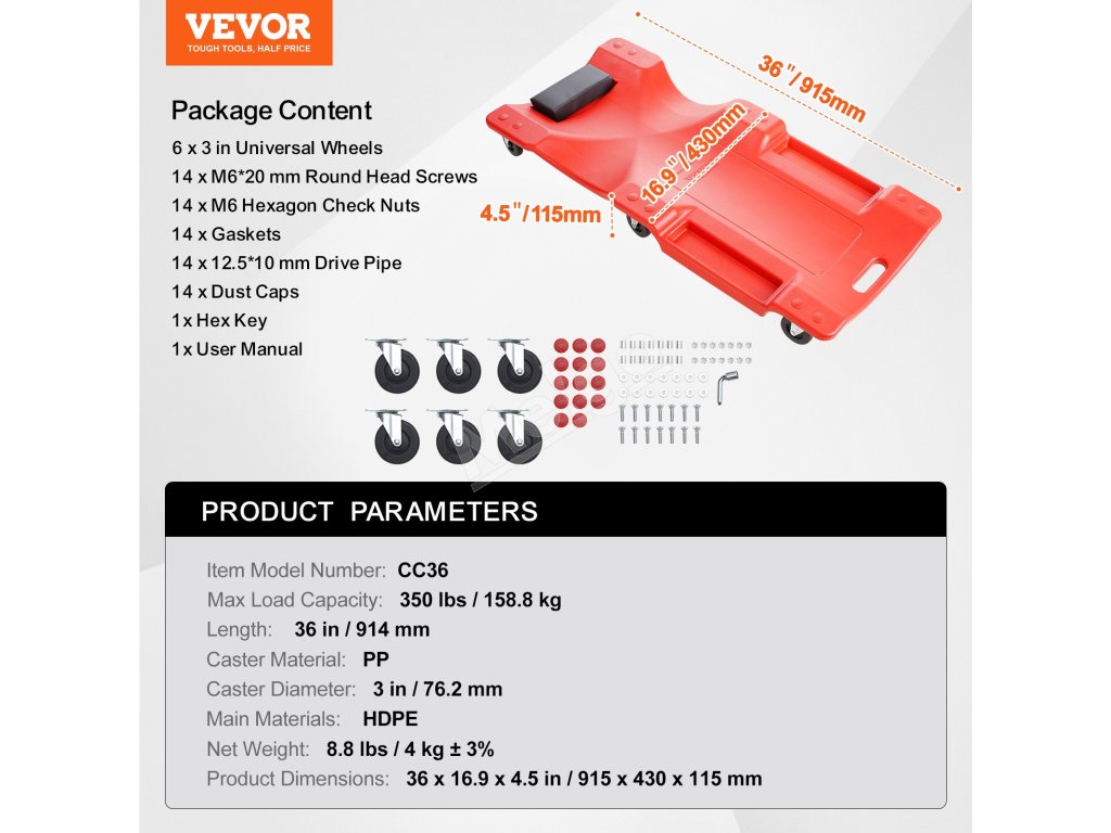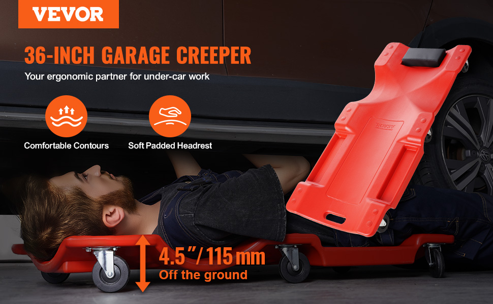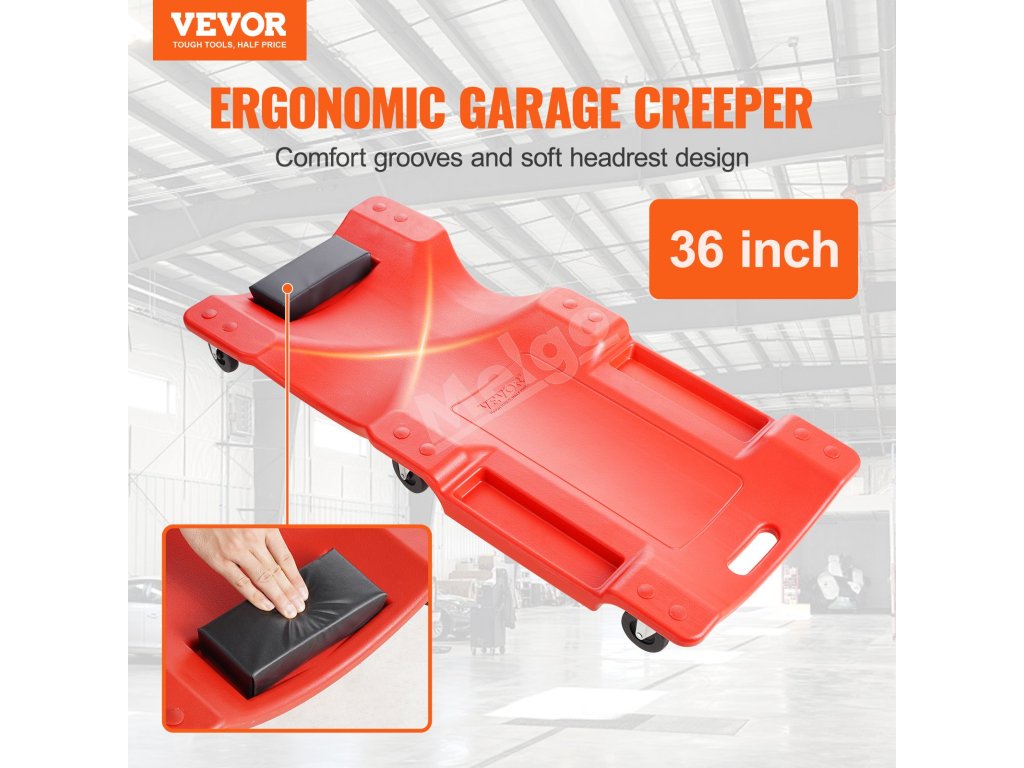 Vďaka kolieskam a nosnosti 350 kg vám náš 36-palcový plazivý vozík pomôže ľahko sa dostať pod stiesnený priestor vozidla a poskytne stabilnú oporu. Robustný plastový rám a mäkká opierka hlavy zaisťujú dlhotrvajúci komfort a zásobníky na náradie sa postarajú o to, aby ste mali náradie vždy na dosah a vaša práca bola efektívnejšia.