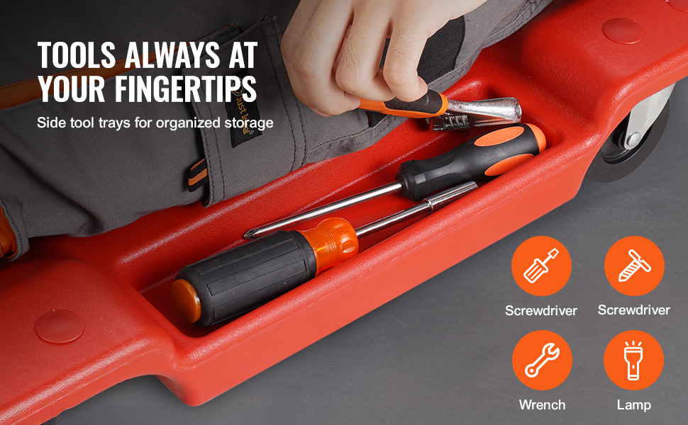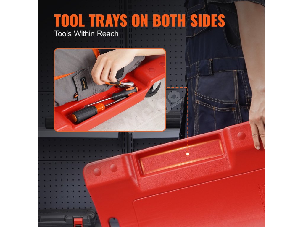 Zásobníky na náradie na oboch stranách automobilového plazivého vozíka poskytujú dostatok priestoru pre vaše opravárenské náradie. Nemusíte vstávať ani siahať ďaleko - všetko, čo potrebujete, budete mať na dosah ruky, aby ste si zvýšili pohodlie.