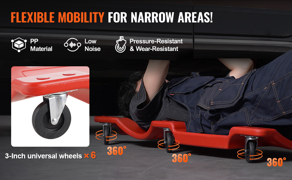 Vďaka nízkej svetlej výške a šiestim otočným kolieskam vám tento mechanický creeper umožňuje bezproblémový pohyb pod vozidlami. Ľahko sa posúvajte zo strany na stranu alebo dopredu a dozadu bez toho, aby ste sa museli namáhať s premiestňovaním.