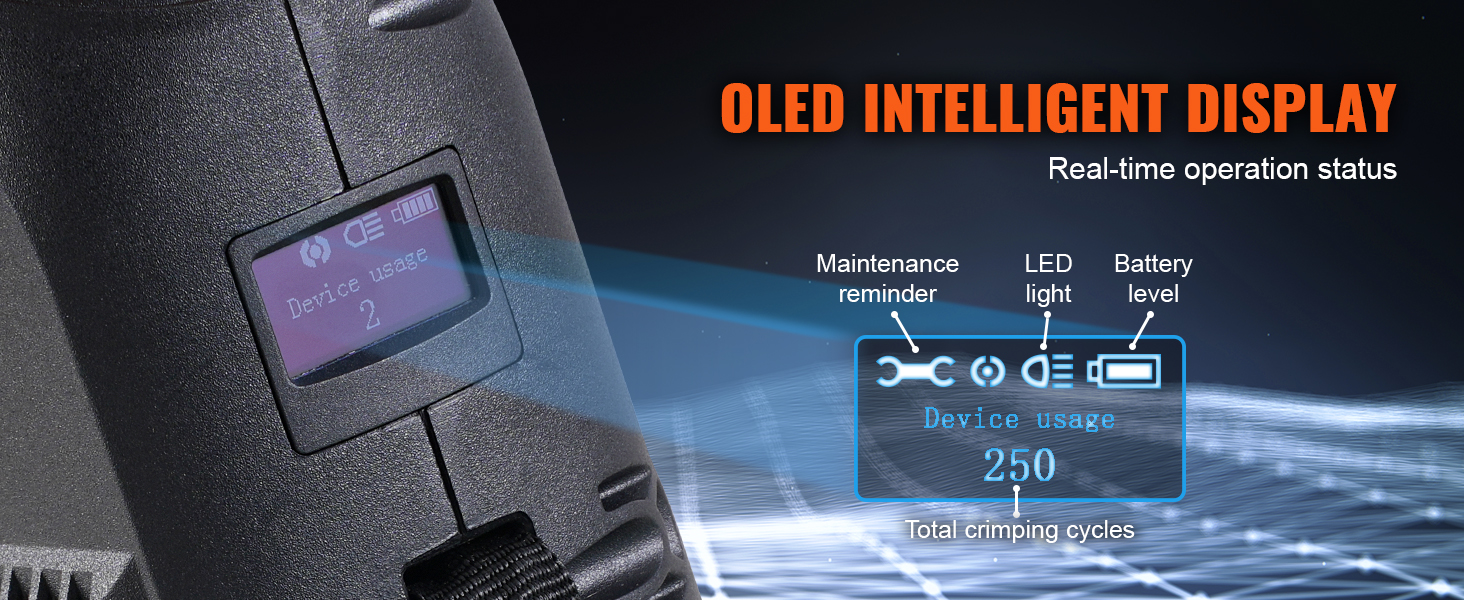 Vybavený displejom OLED, ktorý poskytuje informácie v reálnom čase o úrovni nabitia batérie, pracovnom stave a údajoch o krimpovaní, čo používateľom umožňuje jednoducho sledovať výkon nástroja a spravovať potreby.