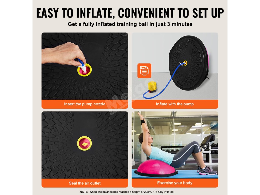 Polovičná lopta na jogu sa rýchlo a jednoducho inštaluje. Loptu stačí pripojiť a stúpiť na priloženú nožnú pumpu, aby sa naplnila. Do minúty sa nafúkne a do niekoľkých sekúnd vypustí. Dodáva sa s bezplatnou nožnou pumpou na rýchle nafúknutie, vysokokvalitný vzduchový ventil zabraňuje úniku, čím zabezpečuje dlhú životnosť.