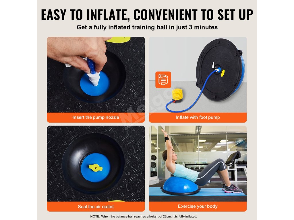 Polovičná lopta na jogu sa rýchlo a jednoducho inštaluje. Loptu stačí pripojiť a stúpiť na priloženú nožnú pumpu, aby sa naplnila. Do minúty sa nafúkne a do niekoľkých sekúnd vypustí. Dodáva sa s bezplatnou nožnou pumpou na rýchle nafúknutie, vysokokvalitný vzduchový ventil zabraňuje úniku, čím zabezpečuje dlhú životnosť.