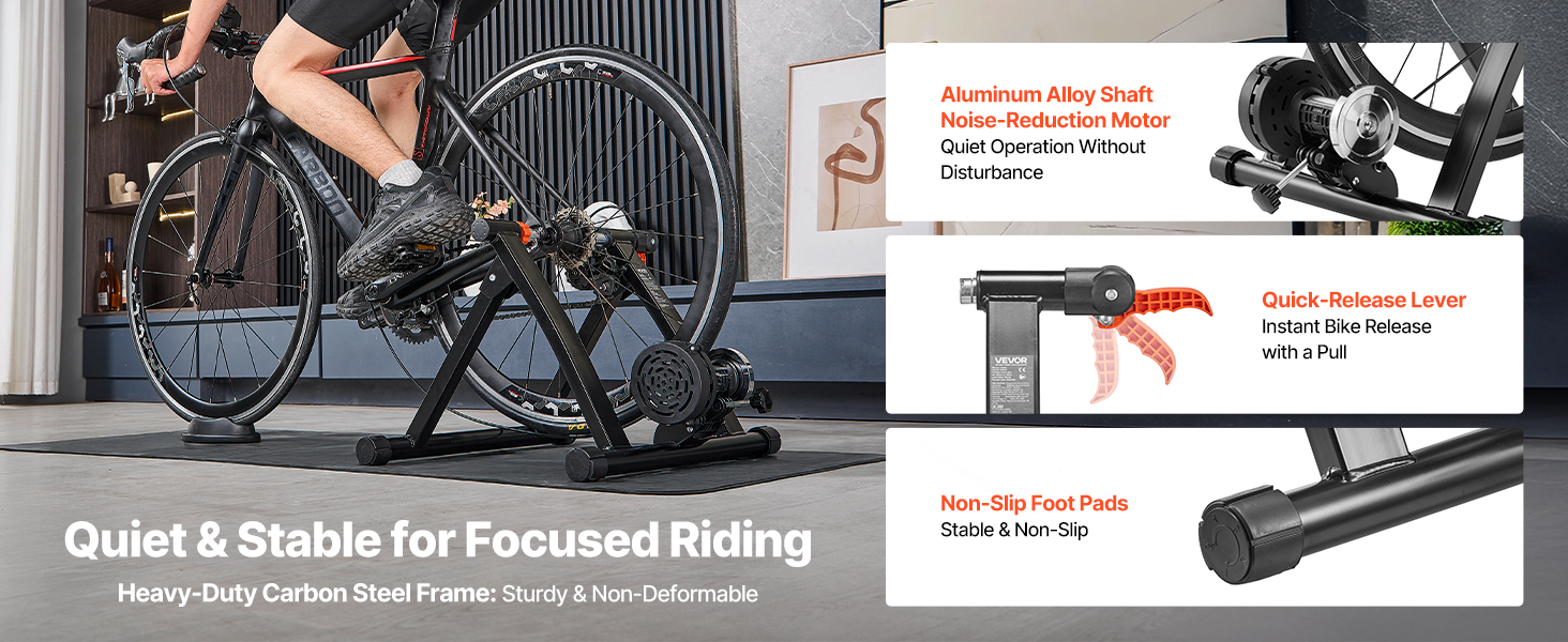 Vďaka odolnej trojuholníkovej konštrukcii z uhlíkovej ocele s protišmykovými podložkami náš odporový cyklotrenažér zlepšuje stabilitu rámu. Jeho rýchloupínacia páka umožňuje jednoduchú inštaláciu/demontáž bicykla a tichý motor s hriadeľom z hliníkovej zliatiny zabezpečuje tichú jazdu na sústredený tréning.