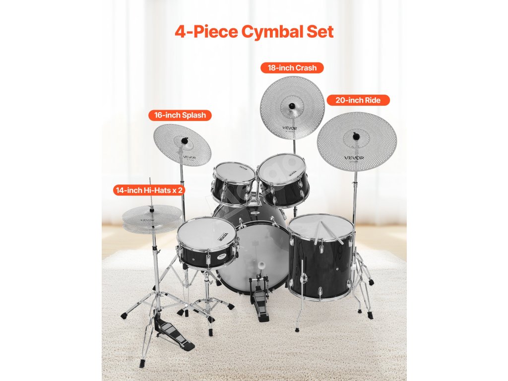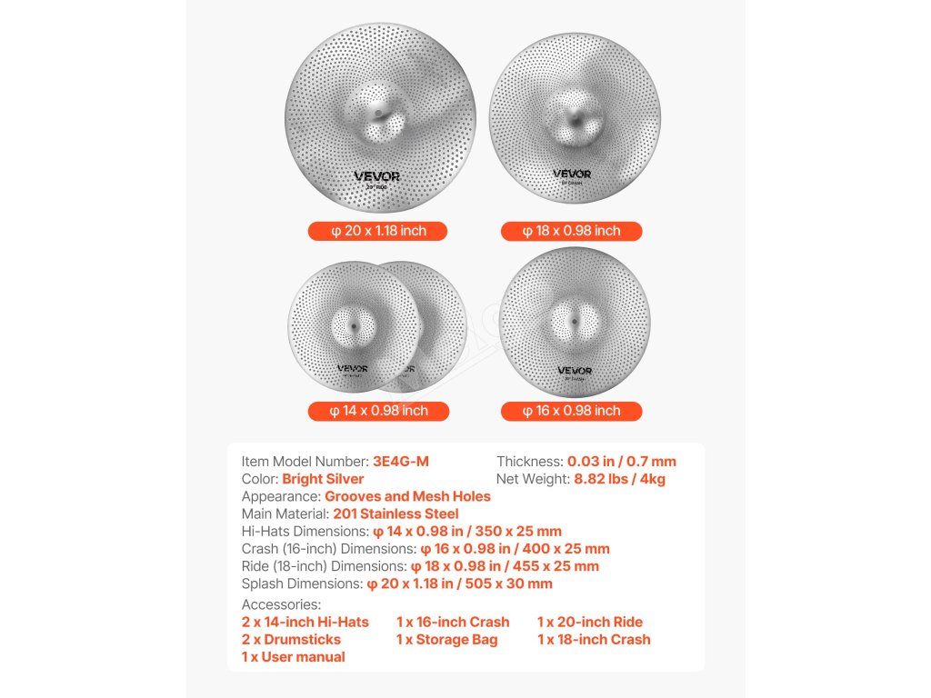 Táto činelová sada obsahuje 4 činely: 14-palcový Hi-Hat, 16-palcový Crash, 18-palcový Crash a 20-palcový Ride. Obsahuje aj 2 paličky, 1 úložnú tašku a 4 tiché podložky. Ideálne pre začiatočníkov, s jasným zvukom a všestrannými tónmi!